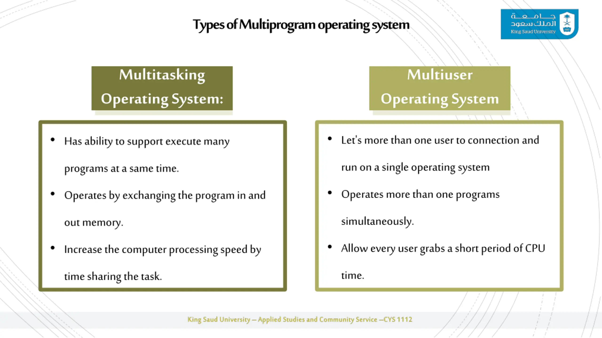 Types of Multiprogram operating system Multitasking Operating System: Multiuser Operating System Let's more than one user to connection and run on a single operating system Operates more than one programs simultaneously. Allow every user grabs a short period of CPU time. Has ability to support execute many programs at a same time. Operates by exchanging the program in and out memory. Increase the computer processing speed by time sharing the task. King Saud University Applied Studies and Community Service CYS 1112