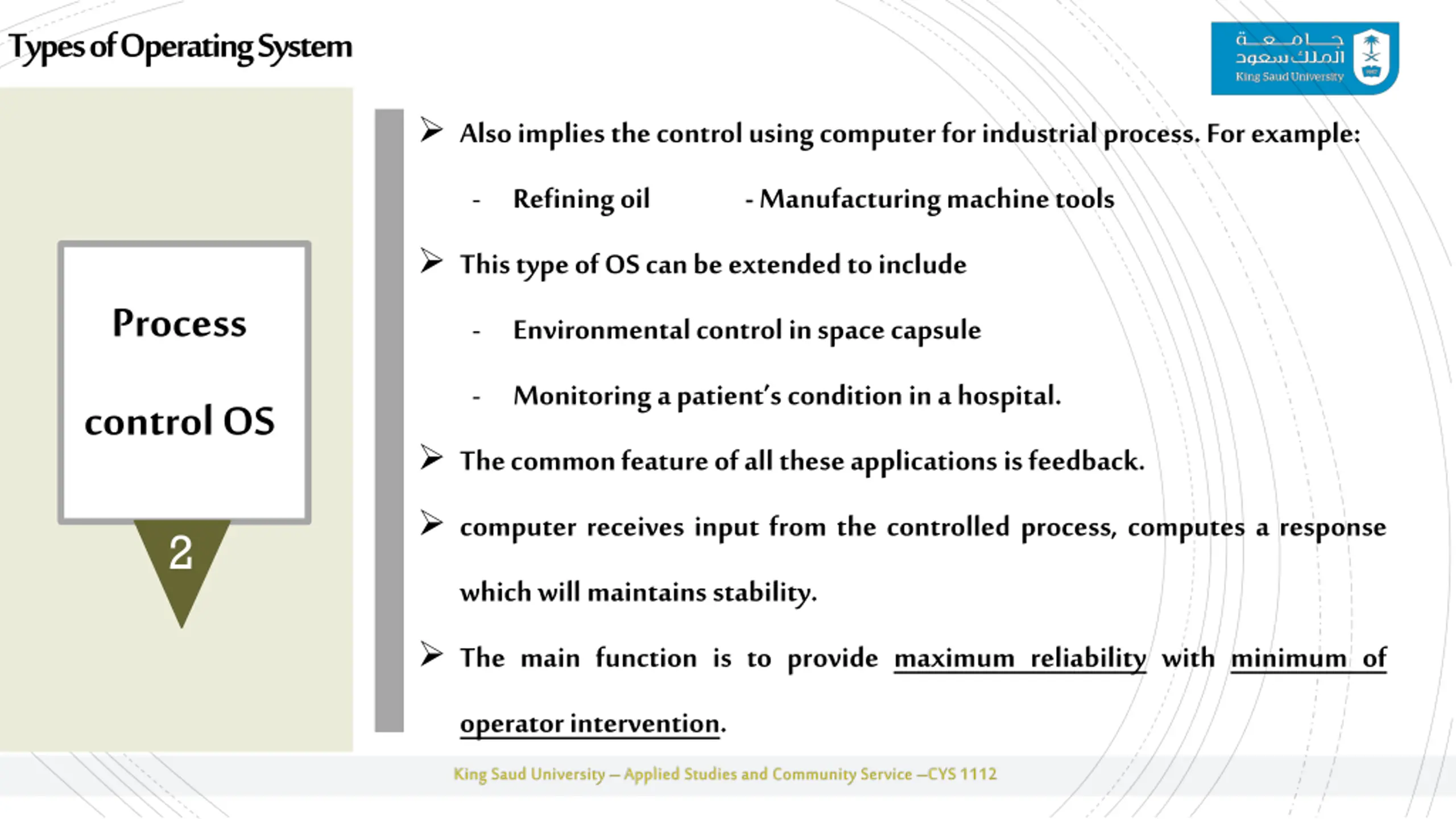 Types of Operating System Also implies the control using computer for industrial process. For example: - Refining oil - Manufacturing machine tools This type of OS can be extended to include - Environmental control in space capsule - Monitoring a patient s condition in a hospital. The common feature of all these applications is feedback. computer receives input from the controlled process, computes a response which will maintains stability. The main function is to provide maximum reliability with minimum of operator intervention. Process control OS 2 King Saud University Applied Studies and Community Service CYS 1112