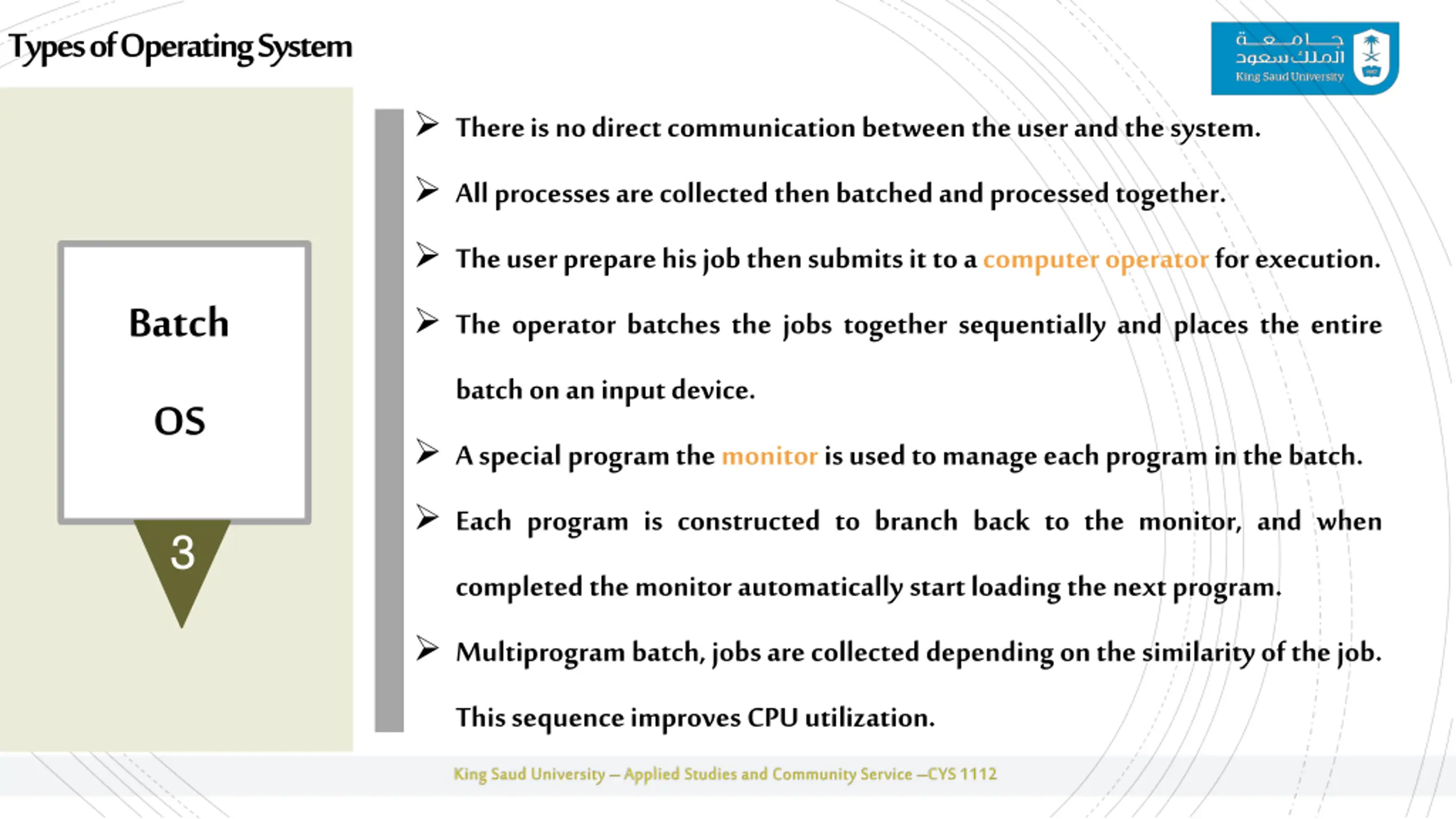Types of Operating System There is no direct communication between the user and the system. All processes are collected then batched and processed together. The user prepare his job then submits it to a computer operator for execution. The operator batches the jobs together sequentially and places the entire batch on an input device. A special program the monitor is used to manage each program in the batch. Each program is constructed to branch back to the monitor, and when completed the monitor automatically start loading the next program. Multiprogram batch, jobs are collected depending on the similarity of the job. This sequence improves CPU utilization. Batch OS 3 King Saud University Applied Studies and Community Service CYS 1112