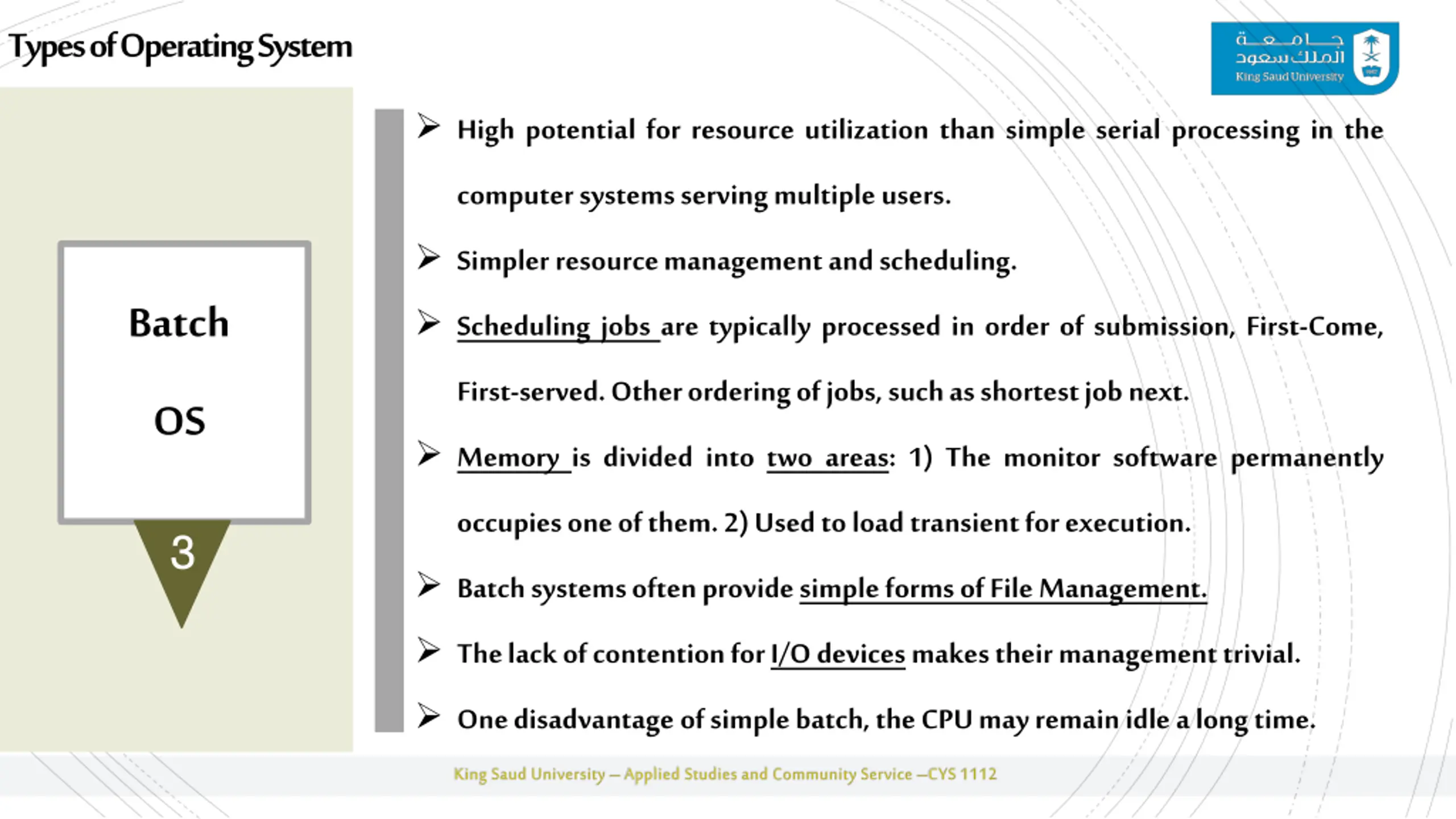 Types of Operating System High potential for resource utilization than simple serial processing in the computer systems serving multiple users. Simpler resource management and scheduling. Scheduling jobs are typically processed in order of submission, First-Come, First-served. Other ordering of jobs, such as shortest job next. Memory is divided into two areas: 1) The monitor software permanently occupies one of them. 2) Used to load transient for execution. Batch systems often provide simple forms of File Management. The lack of contention for I/O devices makes their management trivial. One disadvantage of simple batch, the CPU may remain idle a long time. Batch OS 3 King Saud University Applied Studies and Community Service CYS 1112