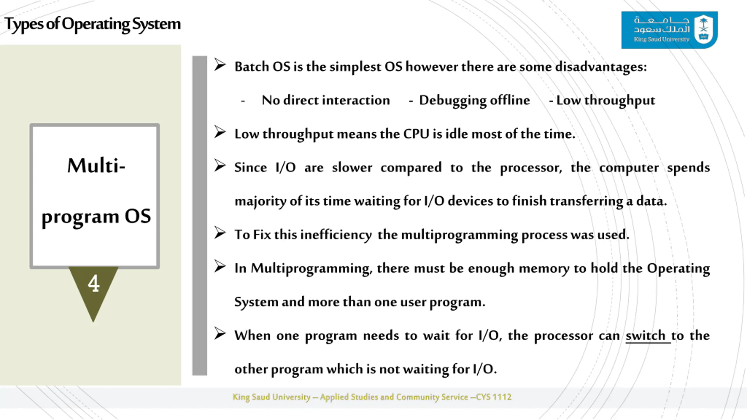 Types of Operating System Batch OS is the simplest OS however there are some disadvantages: - No direct interaction - Debugging offline - Low throughput Low throughput means the CPU is idle most of the time. Since I/O are slower compared to the processor, the computer spends majority of its time waiting for I/O devices to finish transferring a data. To Fix this inefficiency the multiprogramming process was used. In Multiprogramming, there must be enough memory to hold the Operating System and more than one user program. When one program needs to wait for I/O, the processor can switch to the other program which is not waiting for I/O. Multi- program OS 4 King Saud University Applied Studies and Community Service CYS 1112