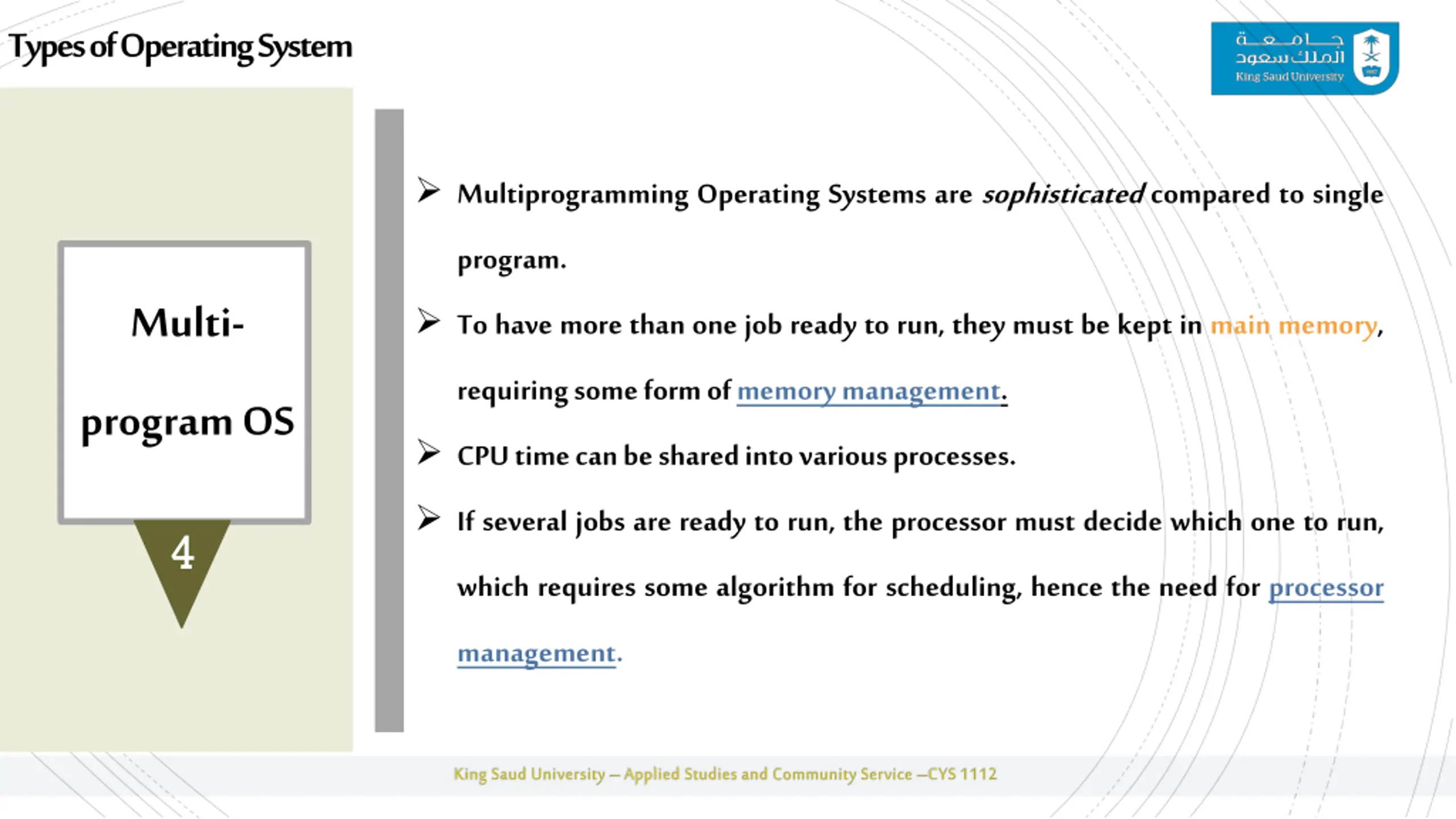 Types of Operating System Multiprogramming Operating Systems are sophisticated compared to single program. To have more than one job ready to run, they must be kept in main memory, requiring some form of memory management. CPU time can be shared into various processes. If several jobs are ready to run, the processor must decide which one to run, which requires some algorithm for scheduling, hence the need for processor management. Multi- program OS 4 King Saud University Applied Studies and Community Service CYS 1112