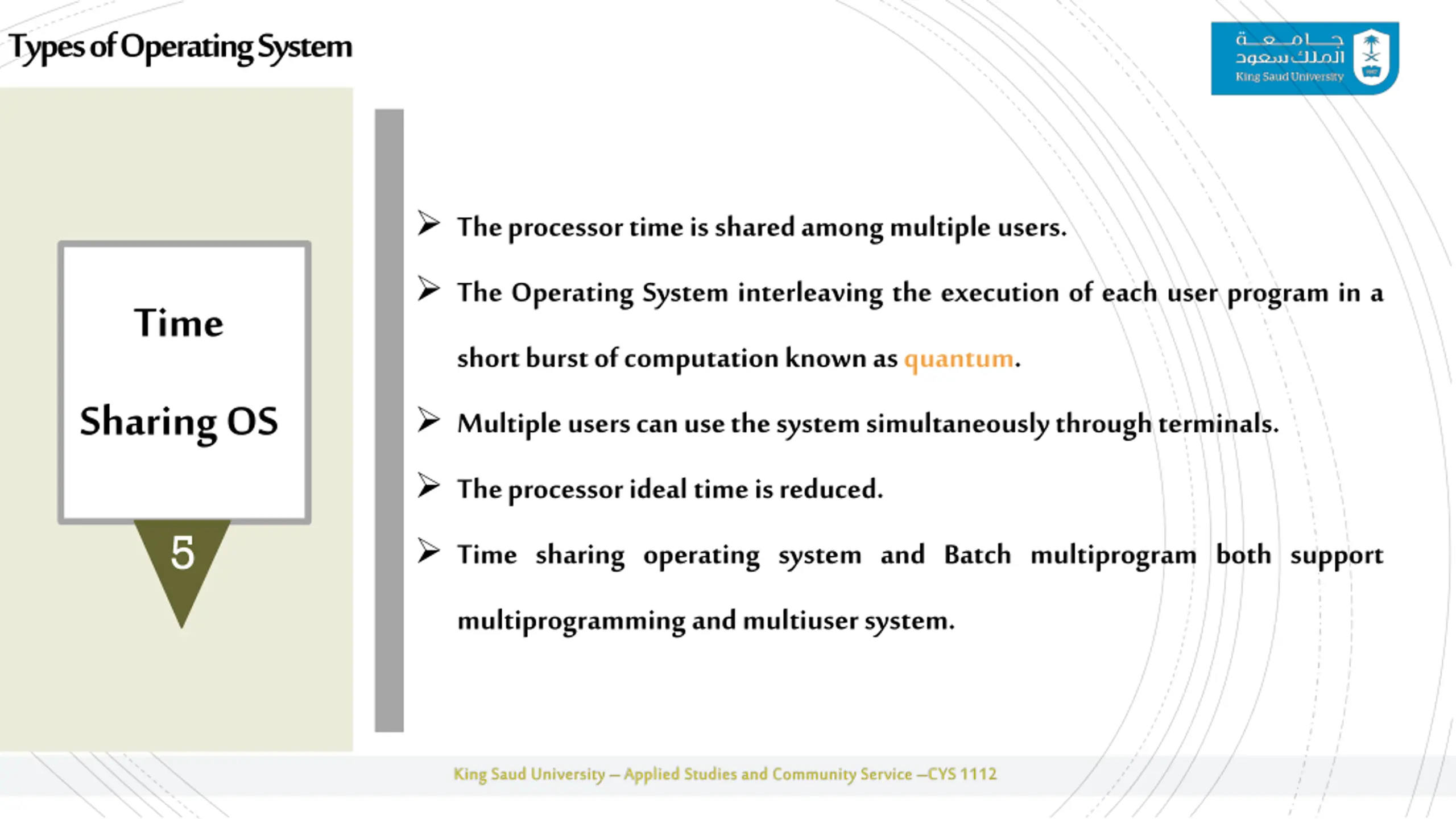 Types of Operating System The processor time is shared among multiple users. The Operating System interleaving the execution of each user program in a short burst of computation known as quantum. Multiple users can use the system simultaneously through terminals. The processor ideal time is reduced. Time sharing operating system and Batch multiprogram both support multiprogramming and multiuser system. Time Sharing OS 5 King Saud University Applied Studies and Community Service CYS 1112