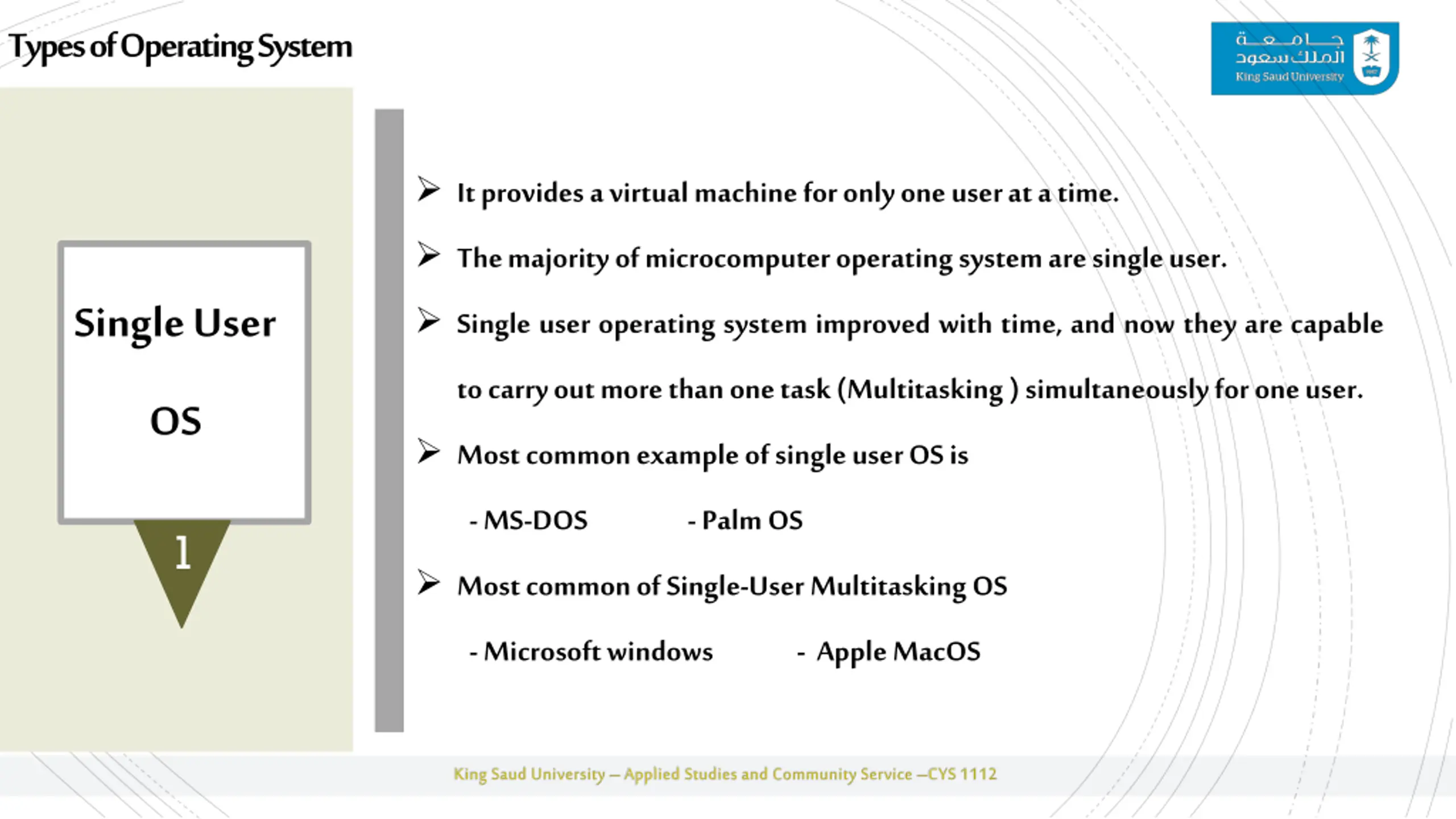 Types of Operating System It provides a virtual machine for only one user at a time. The majority of microcomputer operating system are single user. Single user operating system improved with time, and now they are capable to carry out more than one task (Multitasking ) simultaneously for one user. Most common example of single user OS is - MS-DOS - Palm OS Most common of Single-User Multitasking OS - Microsoft windows - Apple MacOS Single User OS 1 King Saud University Applied Studies and Community Service CYS 1112