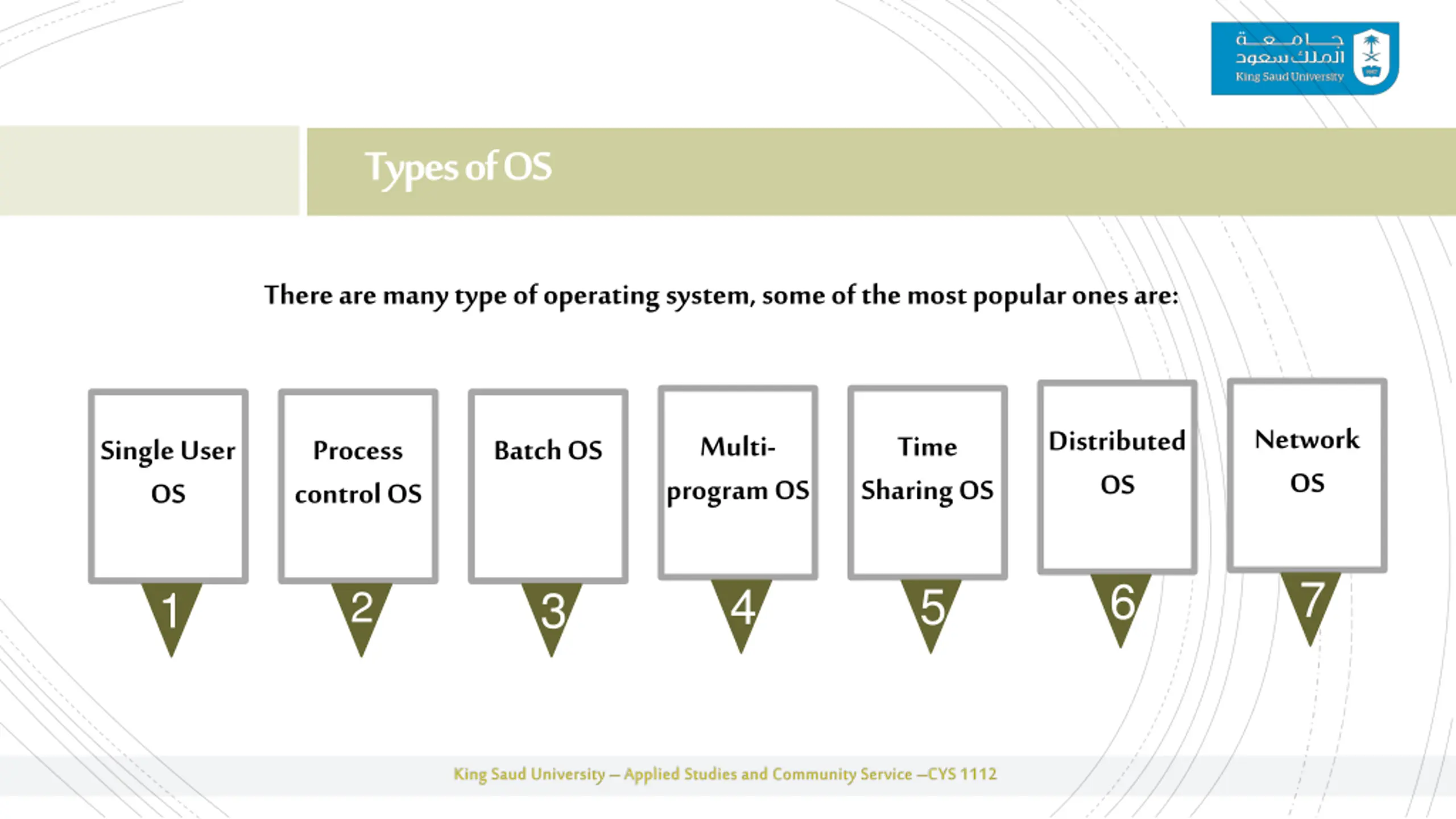 Types of OS There are many type of operating system, some of the most popular ones are: Network OS Distributed OS Multi- program OS Time Single User OS Process control OS Batch OS Sharing OS 7 6 4 5 1 3 2 King Saud University Applied Studies and Community Service CYS 1112