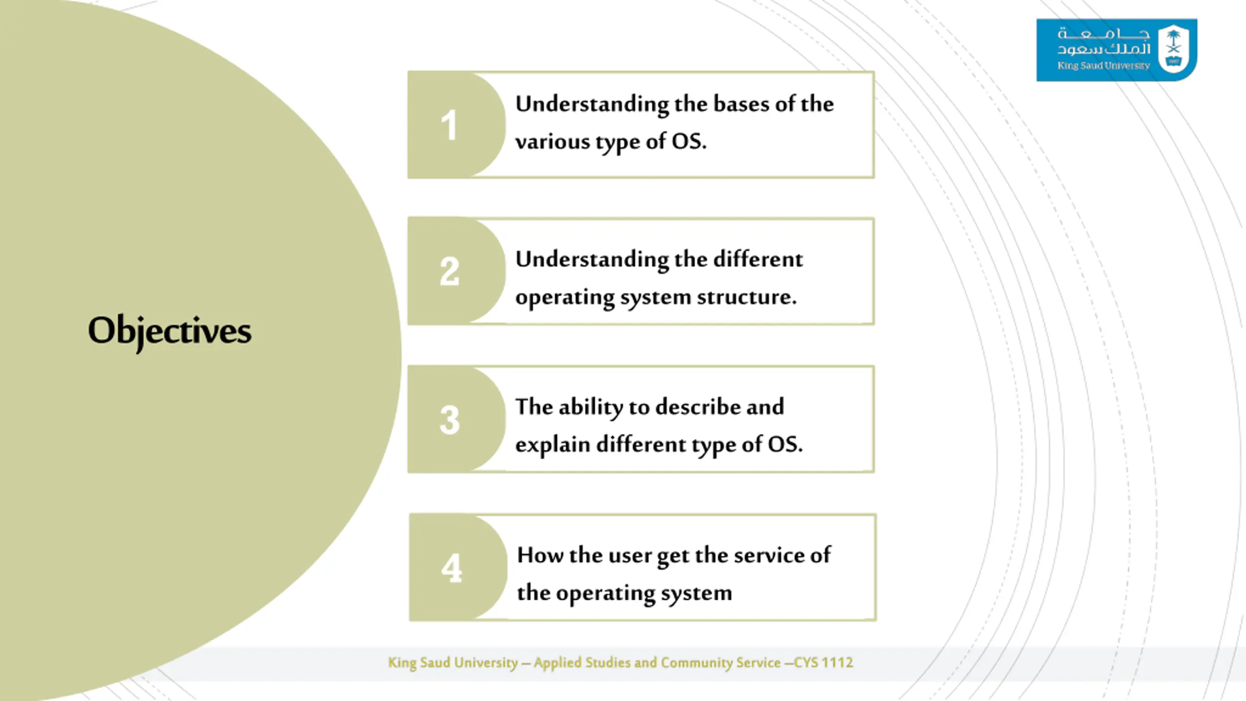 Understanding the bases of the various type of OS. 1 Understanding the different operating system structure. 2 Objectives The ability to describe and explain different type of OS. 3 How the user get the service of the operating system 4 King Saud University Applied Studies and Community Service CYS 1112