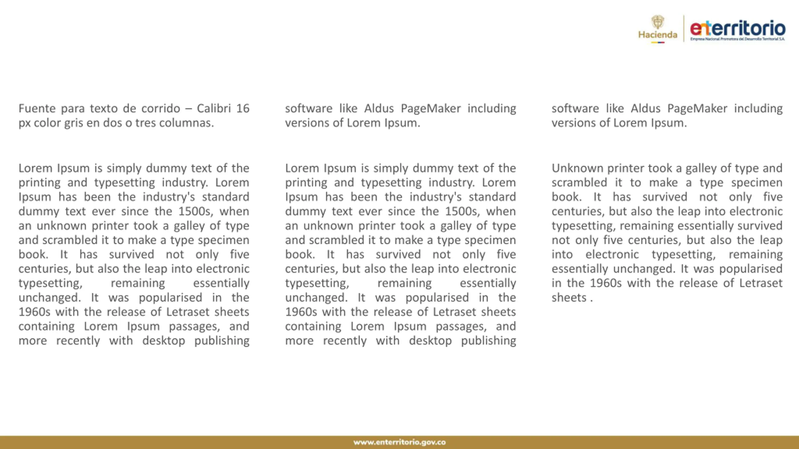 Fuente para texto de corrido Calibri 16 px color gris en dos o tres columnas. software like Aldus PageMaker including versions of Lorem Ipsum. software like Aldus PageMaker including versions of Lorem Ipsum. Lorem Ipsum is simply dummy text of the printing and typesetting industry. Lorem Ipsum has been the industry's standard dummy text ever since the 1500s, when an unknown printer took a galley of type and scrambled it to make a type specimen book. It has survived not only five centuries, but also the leap into electronic typesetting, remaining unchanged. It was popularised in the 1960s with the release of Letraset sheets containing Lorem Ipsum passages, and more recently with desktop publishing Lorem Ipsum is simply dummy text of the printing and typesetting industry. Lorem Ipsum has been the industry's standard dummy text ever since the 1500s, when an unknown printer took a galley of type and scrambled it to make a type specimen book. It has survived not only five centuries, but also the leap into electronic typesetting, remaining unchanged. It was popularised in the 1960s with the release of Letraset sheets containing Lorem Ipsum passages, and more recently with desktop publishing Unknown printer took a galley of type and scrambled it to make a type specimen book. It has survived not only five centuries, but also the leap into electronic typesetting, remaining essentially survived not only five centuries, but also the leap into electronic typesetting, essentially unchanged. It was popularised in the 1960s with the release of Letraset sheets . remaining essentially essentially