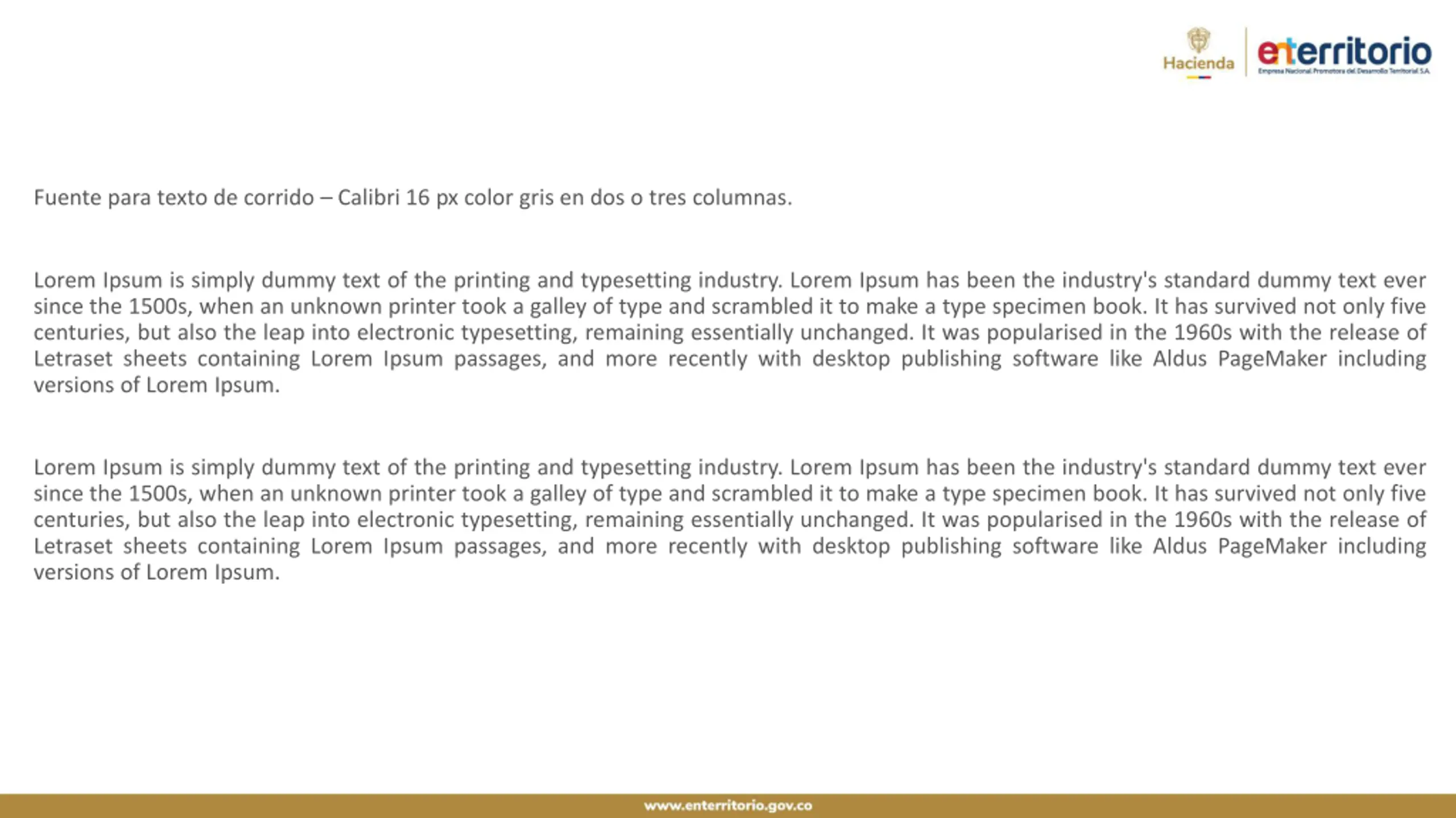 Fuente para texto de corrido Calibri 16 px color gris en dos o tres columnas. Lorem Ipsum is simply dummy text of the printing and typesetting industry. Lorem Ipsum has been the industry's standard dummy text ever since the 1500s, when an unknown printer took a galley of type and scrambled it to make a type specimen book. It has survived not only five centuries, but also the leap into electronic typesetting, remaining essentially unchanged. It was popularised in the 1960s with the release of Letraset sheets containing Lorem Ipsum passages, and more recently with desktop publishing software like Aldus PageMaker including versions of Lorem Ipsum. Lorem Ipsum is simply dummy text of the printing and typesetting industry. Lorem Ipsum has been the industry's standard dummy text ever since the 1500s, when an unknown printer took a galley of type and scrambled it to make a type specimen book. It has survived not only five centuries, but also the leap into electronic typesetting, remaining essentially unchanged. It was popularised in the 1960s with the release of Letraset sheets containing Lorem Ipsum passages, and more recently with desktop publishing software like Aldus PageMaker including versions of Lorem Ipsum.