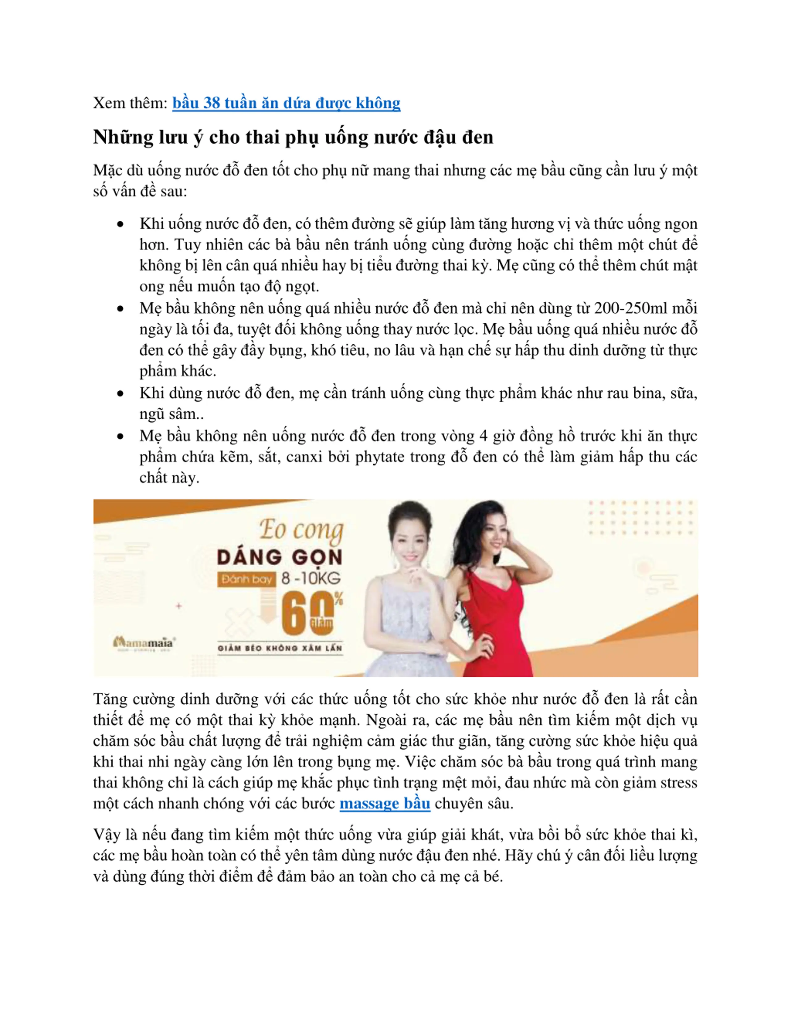 Xem thm: bu 38 tun n da c khng Nh ng l u cho thai ph u ng n c u en M c d u ng n c en t t cho ph n mang thai nh ng c c me b u cu ng c n l u m t s v n sau: Khi u ng n c en, c th m ng s gi p la m t ng h ng v v th c u ng ngon h n. Tuy nhi n c c ba b u n n tr nh u ng cu ng ng ho c ch th m m t ch t kh ng b l n c n qu nhi u hay b ti u ng thai k . Me cu ng c th th m ch t m t ong n u mu n ta o ngo t. Me b u kh ng n n u ng qu nhi u n c en ma ch n n d ng t 200-250ml m i ng y l t i a, tuy t i kh ng u ng thay n c lo c. Me b u u ng qu nhi u n c en c th g y y b ng, kh ti u, no l u v ha n ch s h p thu dinh d ng t th c ph m kh c. Khi du ng n c en, me c n tr nh u ng c ng th c ph m kh c nh rau bina, s a, ngu s m.. Me b u kh ng n n u ng n c en trong v ng 4 gi ng h tr c khi n th c ph m ch a k m, s t, canxi b i phytate trong en c th l m gia m h p thu c c ch t n y. T ng c ng dinh d ng v i c c th c u ng t t cho s c kho e nh n c en la r t c n thi t me c m t thai k kho e ma nh. Ngo i ra, c c me b u n n t m ki m m t d ch v ch m s c b u ch t l ng tra i nghi m ca m gi c th gi n, t ng c ng s c kho e hi u qua khi thai nhi ng y c ng l n l n trong b ng me . Vi c ch m s c ba b u trong qu tr nh mang thai kh ng ch l c ch gi p me kh c ph c t nh tra ng m t mo i, au nh c m c n gia m stress m t c ch nhanh ch ng v i c c b c massage b u chuy n s u. V y l n u ang t m ki m m t th c u ng v a gi p gia i kh t, v a b i b s c kho e thai k , c c me b u ho n to n c th y n t m du ng n c u en nh . H y ch c n i li u l ng va du ng ng th i i m a m ba o an to n cho ca me ca b .