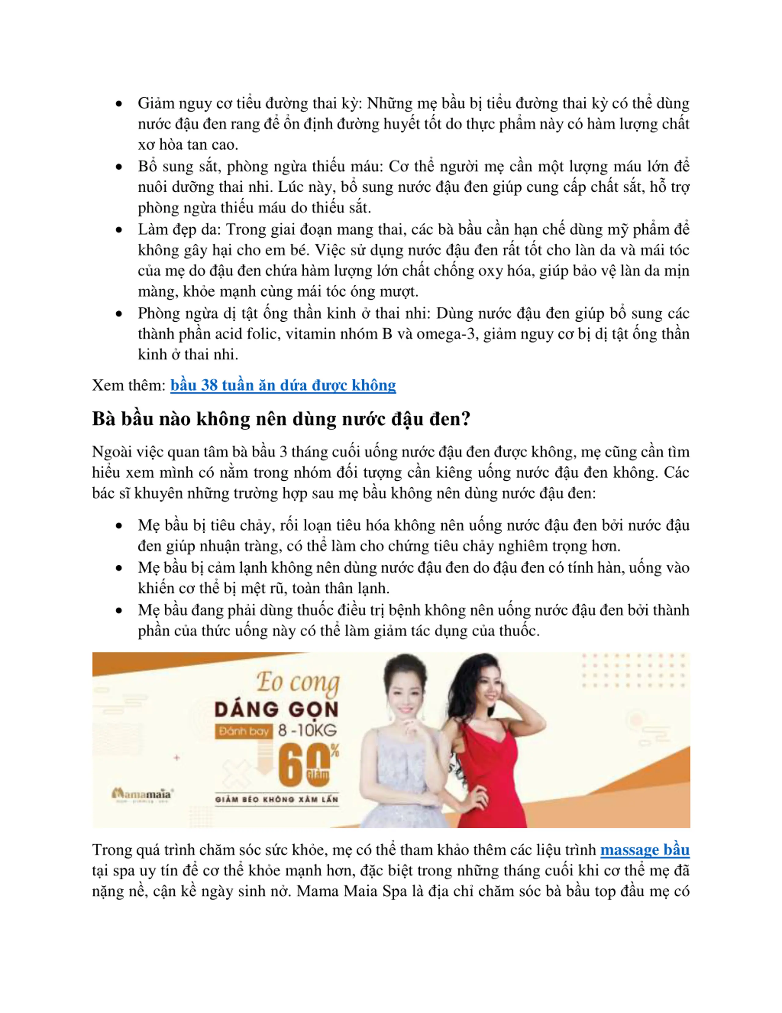 Gim nguy c tiu ng thai k: Nhng m bu b tiu ng thai k c th dng n c u en rang n nh ng huy t t t do th c ph m n y c h m l ng ch t x h a tan cao. B sung s t, ph ng ng a thi u m u: C th ng i m c n m t l ng m u l n nu i d ng thai nhi. L c n y, b sung n c u en gi p cung c p ch t s t, h tr ph ng ng a thi u m u do thi u s t. L m p da: Trong giai o n mang thai, c c b b u c n h n ch d ng m ph m kh ng g y h i cho em b . Vi c s d ng n c u en r t t t cho l n da v m i t c c a m do u en ch a h m l ng l n ch t ch ng oxy h a, gi p b o v l n da m n m ng, kh e m nh c ng m i t c ng m t. Ph ng ng a d t t ng th n kinh thai nhi: D ng n c u en gi p b sung c c th nh ph n acid folic, vitamin nh m B v omega-3, gi m nguy c b d t t ng th n kinh thai nhi. Xem th m: b u 38 tu n n d a c kh ng B b u n o kh ng n n d ng n c u en? Ngo i vi c quan t m b b u 3 th ng cu i u ng n c u en c kh ng, m c ng c n t m hi u xem m nh c n m trong nh m i t ng c n ki ng u ng n c u en kh ng. C c b c s khuy n nh ng tr ng h p sau m b u kh ng n n d ng n c u en: M b u b ti u ch y, r i lo n ti u h a kh ng n n u ng n c u en b i n c u en gi p nhu n tr ng, c th l m cho ch ng ti u ch y nghi m tr ng h n. M b u b c m l nh kh ng n n d ng n c u en do u en c t nh h n, u ng v o khi n c th b m t r , to n th n l nh. M b u ang ph i d ng thu c i u tr b nh kh ng n n u ng n c u en b i th nh ph n c a th c u ng n y c th l m gi m t c d ng c a thu c. Trong qu tr nh ch m s c s c kh e, m c th tham kh o th m c c li u tr nh massage b u t i spa uy t n c th kh e m nh h n, c bi t trong nh ng th ng cu i khi c th m n ng n , c n k ng y sinh n . Mama Maia Spa l a ch ch m s c b b u top u m c