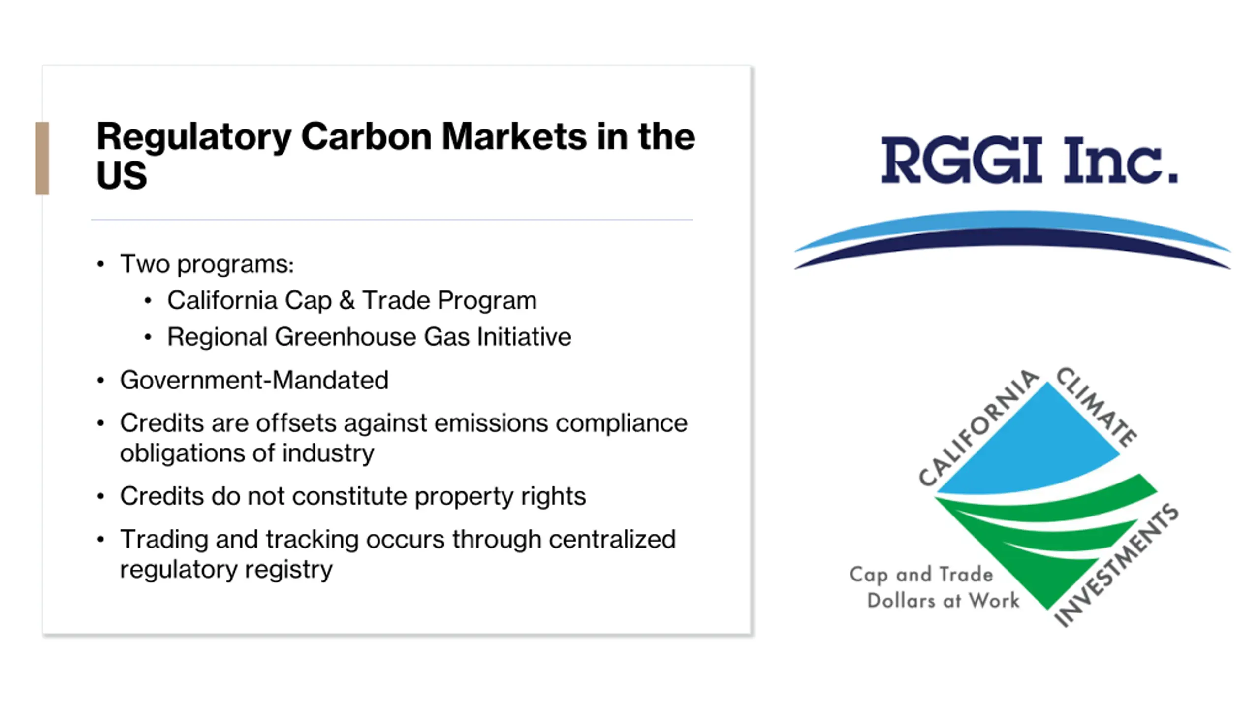 Regulatory Carbon Markets in the US Two programs: California Cap & Trade Program Regional Greenhouse Gas Initiative Government-Mandated Credits are offsets against emissions compliance obligations of industry Credits do not constitute property rights Trading and tracking occurs through centralized regulatory registry