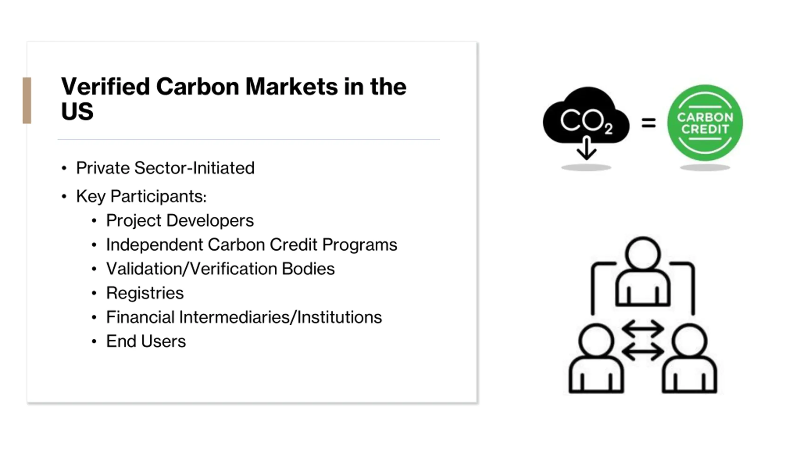 Verified Carbon Markets in the US Private Sector-Initiated Key Participants: Project Developers Independent Carbon Credit Programs Validation/Verification Bodies Registries Financial Intermediaries/Institutions End Users