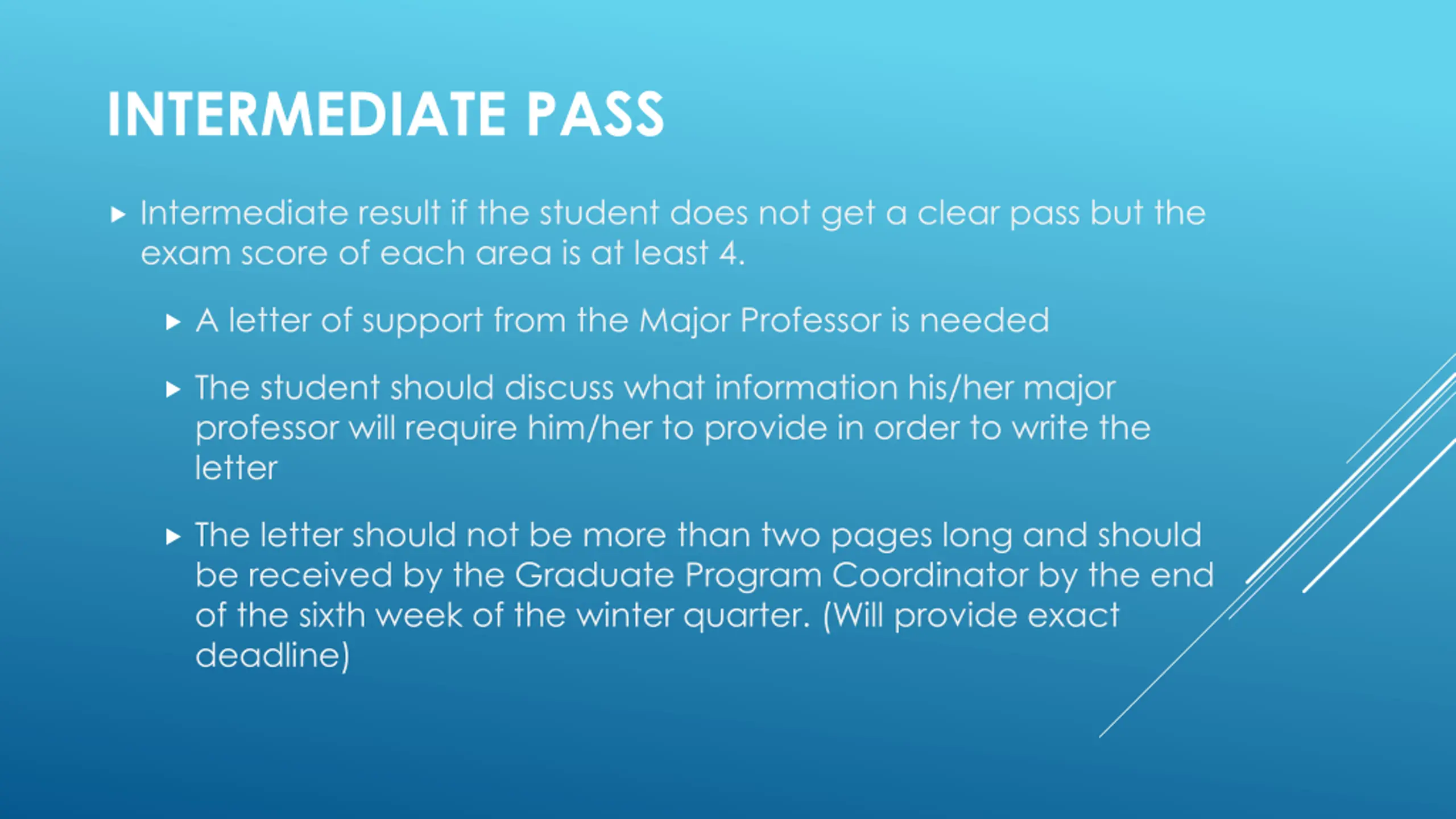 INTERMEDIATE PASS Intermediate result if the student does not get a clear pass but the exam score of each area is at least 4. A letter of support from the Major Professor is needed The student should discuss what information his/her major professor will require him/her to provide in order to write the letter The letter should not be more than two pages long and should be received by the Graduate Program Coordinator by the end of the sixth week of the winter quarter. (Will provide exact deadline)