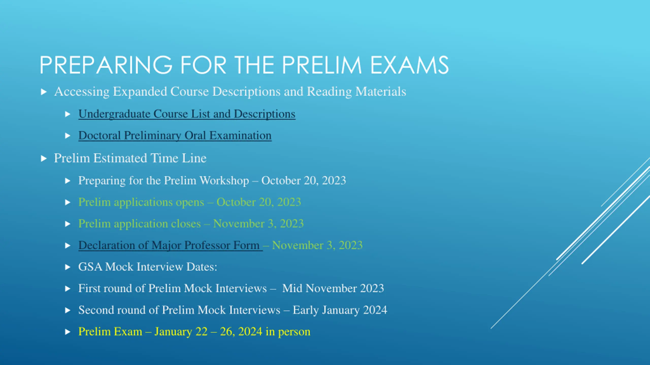 PREPARING FOR THE PRELIM EXAMS Accessing Expanded Course Descriptions and Reading Materials Undergraduate Course List and Descriptions Doctoral Preliminary Oral Examination Prelim Estimated Time Line Preparing for the Prelim Workshop October 20, 2023 Prelim applications opens October 20, 2023 Prelim application closes November 3, 2023 Declaration of Major Professor Form November 3, 2023 GSA Mock Interview Dates: First round of Prelim Mock Interviews Mid November 2023 Second round of Prelim Mock Interviews Early January 2024 Prelim Exam January 22 26, 2024 in person