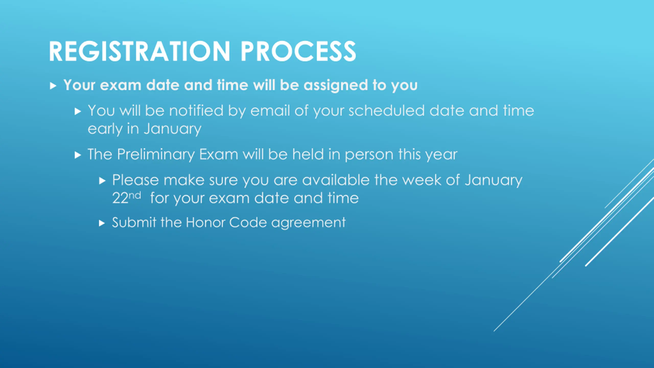 REGISTRATION PROCESS Your exam date and time will be assigned to you You will be notified by email of your scheduled date and time early in January The Preliminary Exam will be held in person this year Please make sure you are available the week of January 22nd for your exam date and time Submit the Honor Code agreement