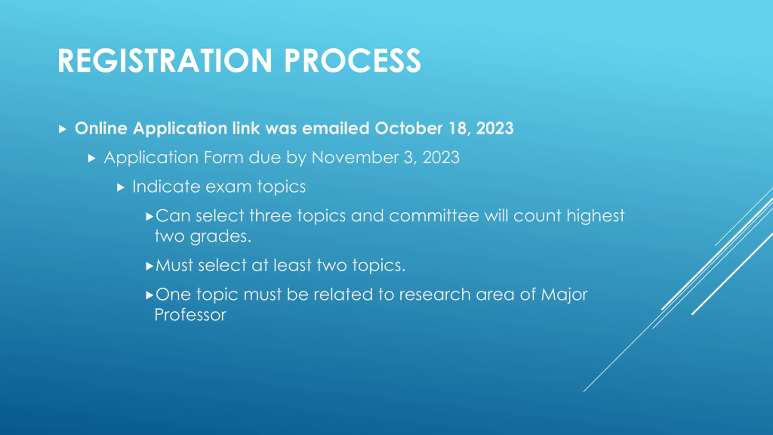 REGISTRATION PROCESS Online Application link was emailed October 18, 2023 Application Form due by November 3, 2023 Indicate exam topics Can select three topics and committee will count highest two grades. Must select at least two topics. One topic must be related to research area of Major Professor