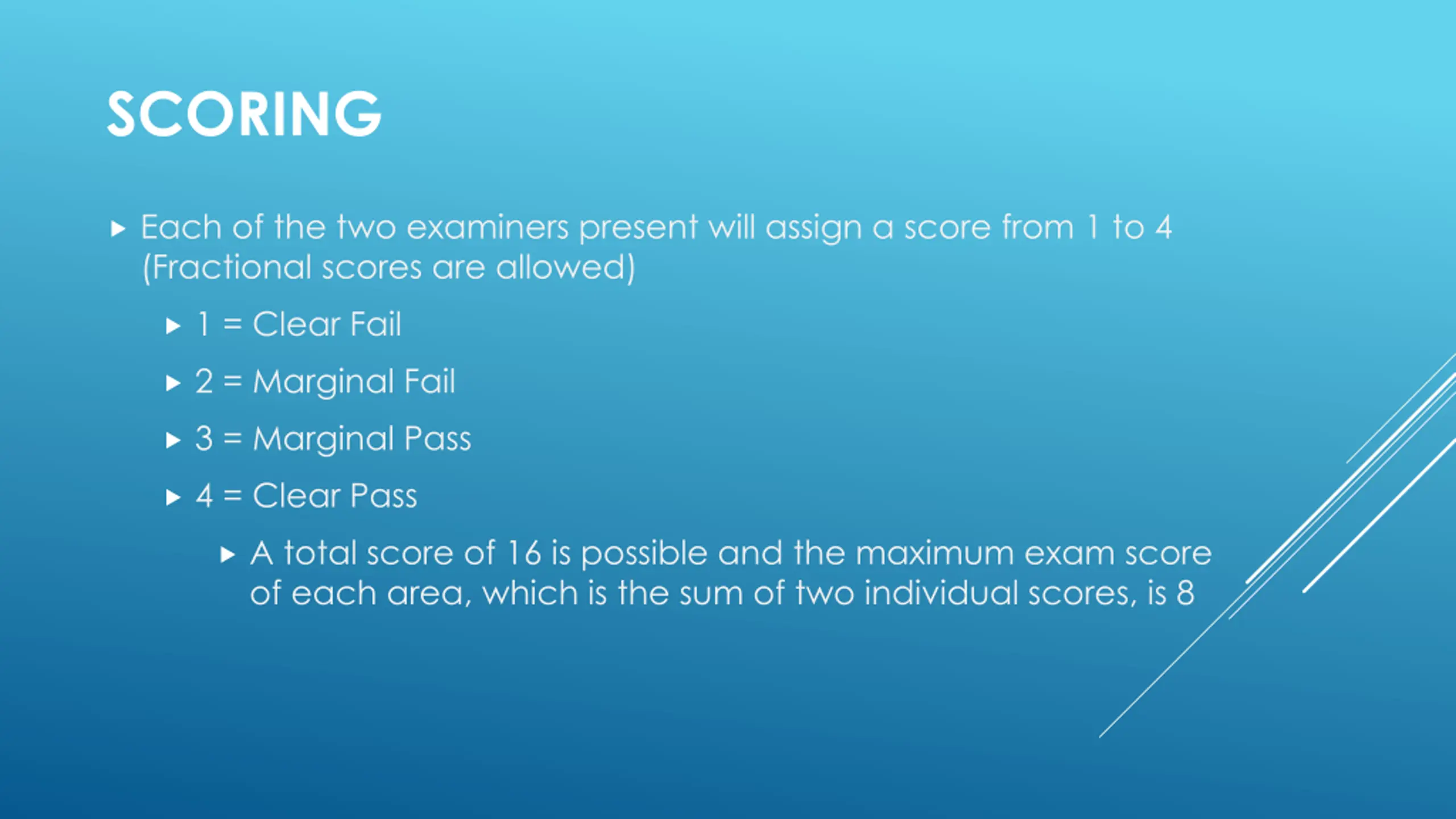 SCORING Each of the two examiners present will assign a score from 1 to 4 (Fractional scores are allowed) 1 = Clear Fail 2 = Marginal Fail 3 = Marginal Pass 4 = Clear Pass A total score of 16 is possible and the maximum exam score of each area, which is the sum of two individual scores, is 8