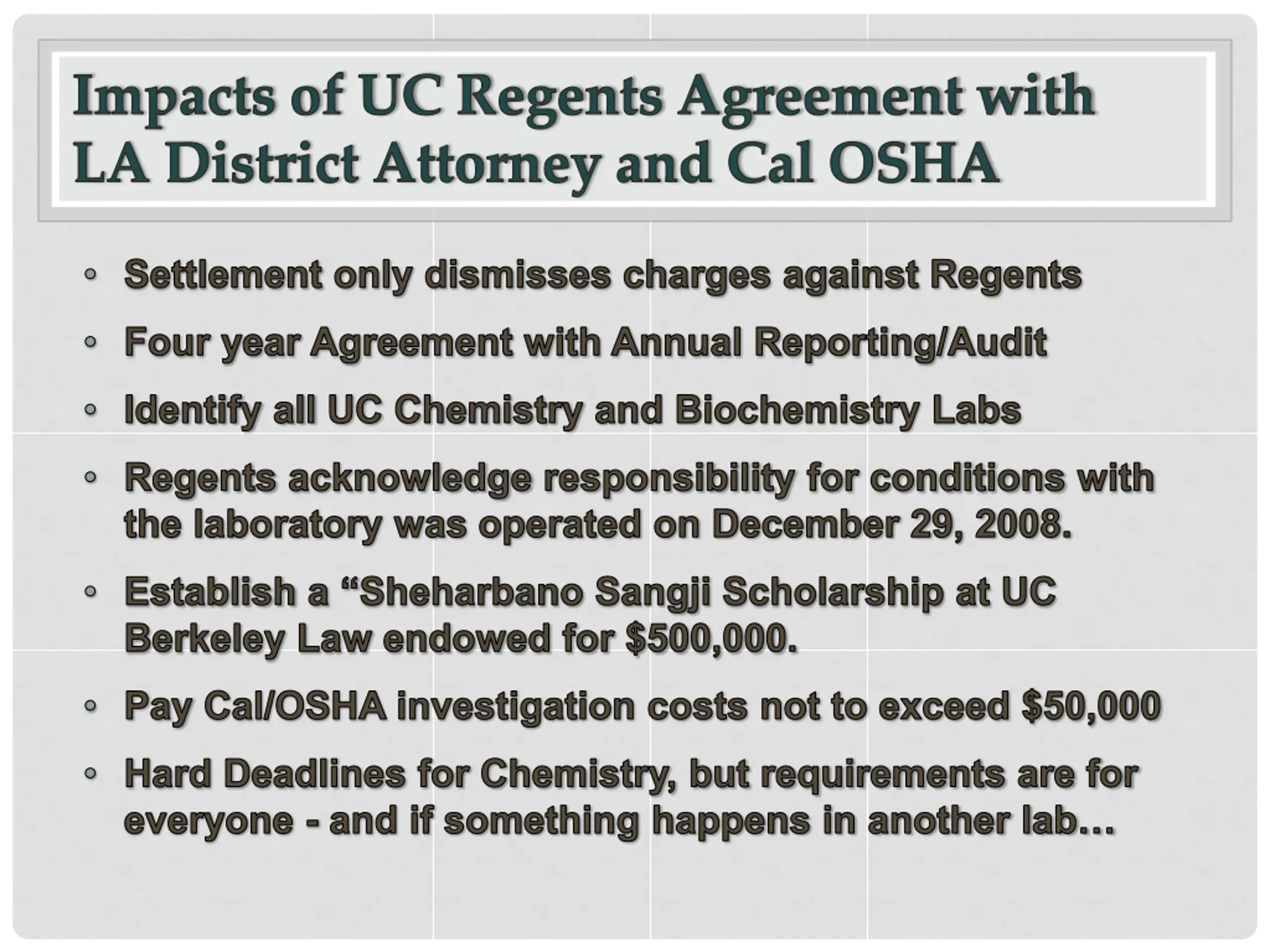 Impacts of UC Regents Agreement with LA District Attorney and Cal OSHA Settlement only dismisses charges against Regents Four year Agreement with Annual Reporting/Audit Identify all UC Chemistry and Biochemistry Labs Regents acknowledge responsibility for conditions with the laboratory was operated on December 29, 2008. Establish a Sheharbano Sangji Scholarship at UC Berkeley Law endowed for $500,000. Pay Cal/OSHA investigation costs not to exceed $50,000 Hard Deadlines for Chemistry, but requirements are for everyone - and if something happens in another lab