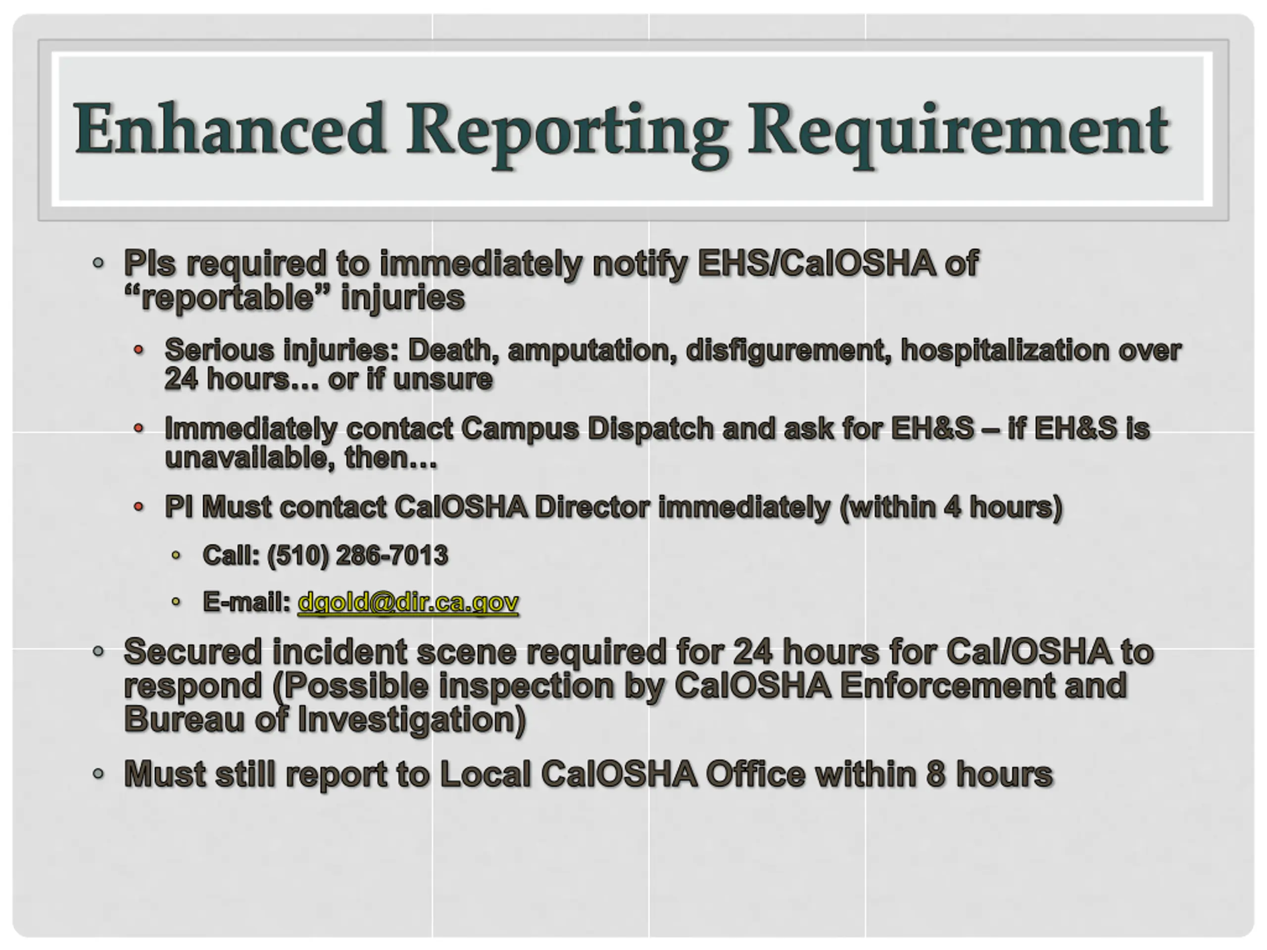 Enhanced Reporting Requirement PIs required to immediately notify EHS/CalOSHA of reportable injuries Serious injuries: Death, amputation, disfigurement, hospitalization over 24 hours or if unsure Immediately contact Campus Dispatch and ask for EH&S if EH&S is unavailable, then PI Must contact CalOSHA Director immediately (within 4 hours) Call: (510) 286-7013 E-mail: dgold@dir.ca.gov Secured incident scene required for 24 hours for Cal/OSHA to respond (Possible inspection by CalOSHA Enforcement and Bureau of Investigation) Must still report to Local CalOSHA Office within 8 hours