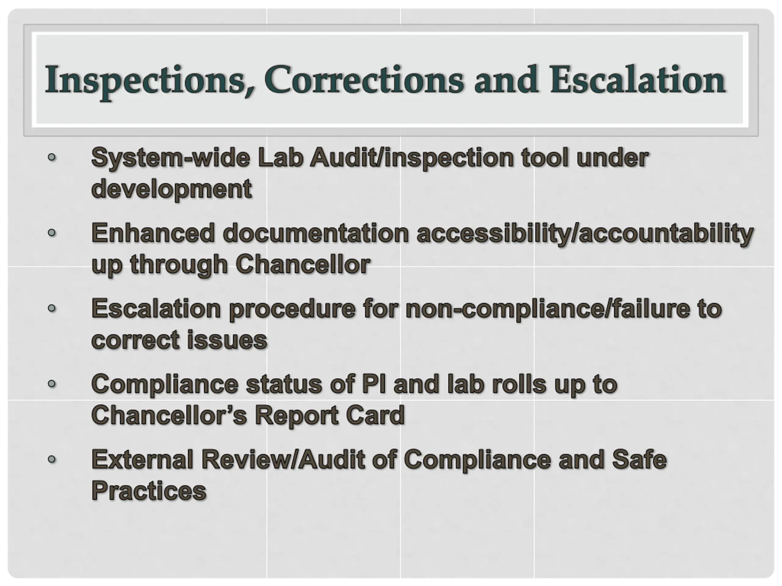 Inspections, Corrections and Escalation System-wide Lab Audit/inspection tool under development Enhanced documentation accessibility/accountability up through Chancellor Escalation procedure for non-compliance/failure to correct issues Compliance status of PI and lab rolls up to Chancellor s Report Card External Review/Audit of Compliance and Safe Practices