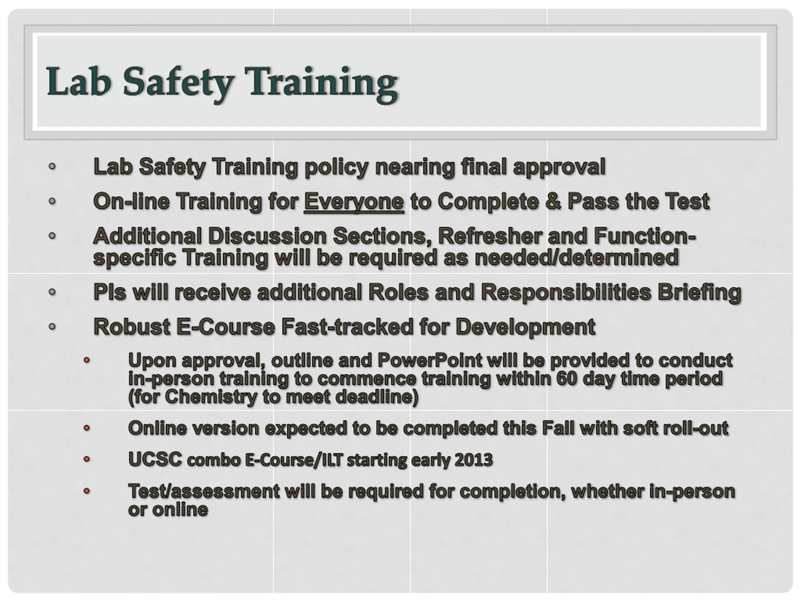 Lab Safety Training Lab Safety Training policy nearing final approval On-line Training for Everyone to Complete & Pass the Test Additional Discussion Sections, Refresher and Function- specific Training will be required as needed/determined PIs will receive additional Roles and Responsibilities Briefing Robust E-Course Fast-tracked for Development Upon approval, outline and PowerPoint will be provided to conduct in-person training to commence training within 60 day time period (for Chemistry to meet deadline) Online version expected to be completed this Fall with soft roll-out UCSC combo E-Course/ILT starting early 2013 Test/assessment will be required for completion, whether in-person or online
