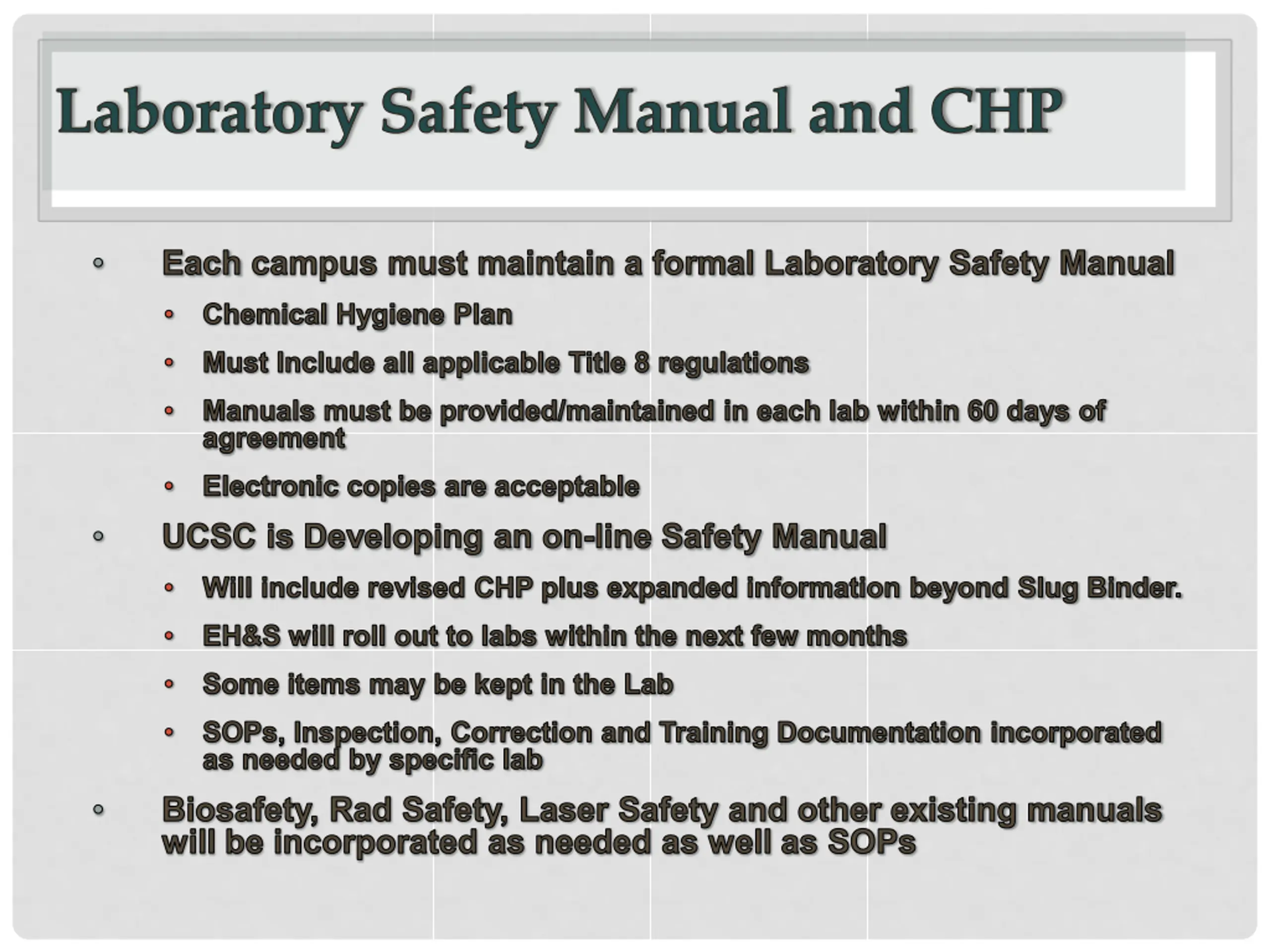 Laboratory Safety Manual and CHP Each campus must maintain a formal Laboratory Safety Manual Chemical Hygiene Plan Must Include all applicable Title 8 regulations Manuals must be provided/maintained in each lab within 60 days of agreement Electronic copies are acceptable UCSC is Developing an on-line Safety Manual Will include revised CHP plus expanded information beyond Slug Binder. EH&S will roll out to labs within the next few months Some items may be kept in the Lab SOPs, Inspection, Correction and Training Documentation incorporated as needed by specific lab Biosafety, Rad Safety, Laser Safety and other existing manuals will be incorporated as needed as well as SOPs