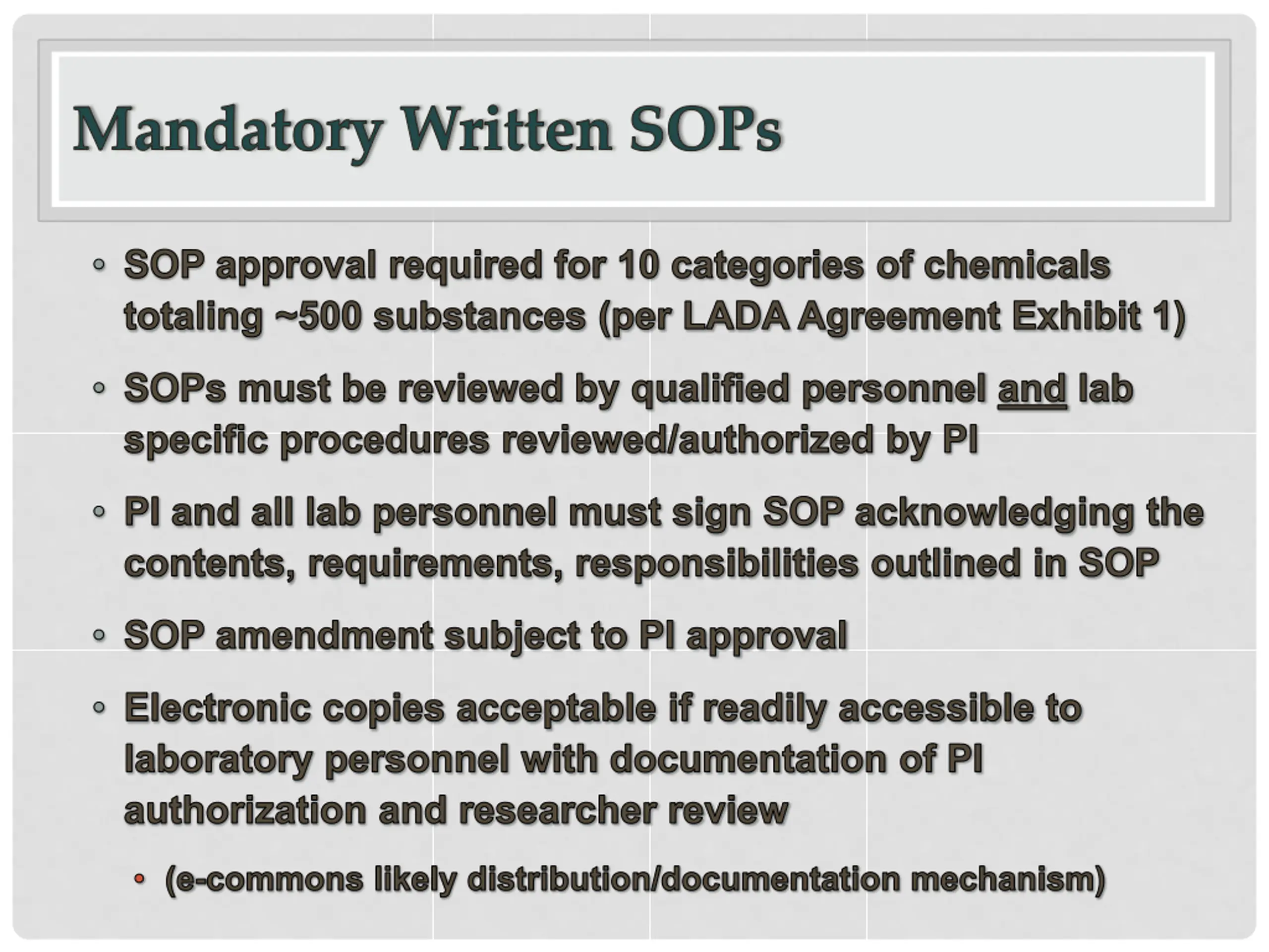 Mandatory Written SOPs SOP approval required for 10 categories of chemicals totaling ~500 substances (per LADA Agreement Exhibit 1) SOPs must be reviewed by qualified personnel and lab specific procedures reviewed/authorized by PI PI and all lab personnel must sign SOP acknowledging the contents, requirements, responsibilities outlined in SOP SOP amendment subject to PI approval Electronic copies acceptable if readily accessible to laboratory personnel with documentation of PI authorization and researcher review (e-commons likely distribution/documentation mechanism)