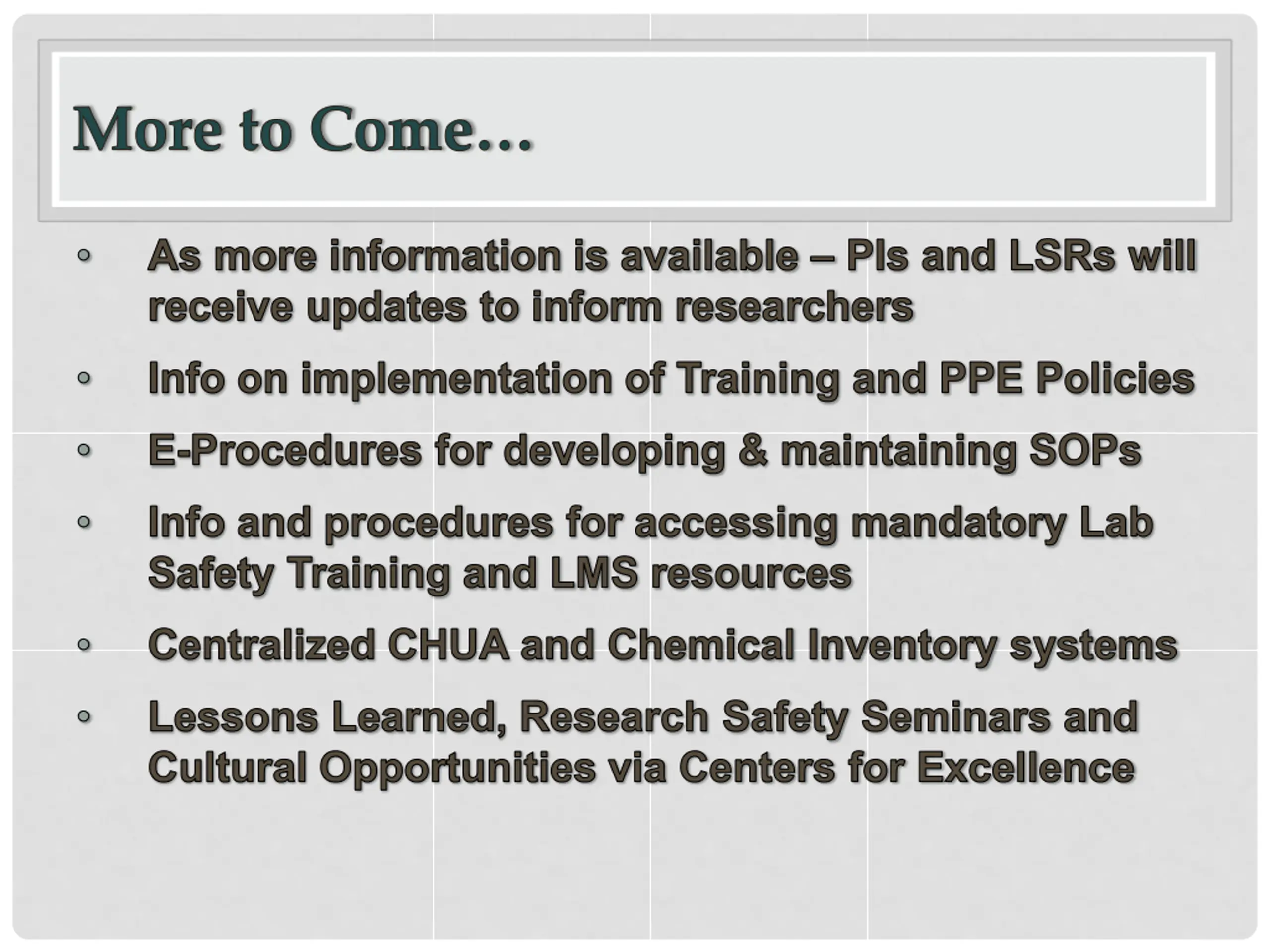 More to Come As more information is available PIs and LSRs will receive updates to inform researchers Info on implementation of Training and PPE Policies E-Procedures for developing & maintaining SOPs Info and procedures for accessing mandatory Lab Safety Training and LMS resources Centralized CHUA and Chemical Inventory systems Lessons Learned, Research Safety Seminars and Cultural Opportunities via Centers for Excellence