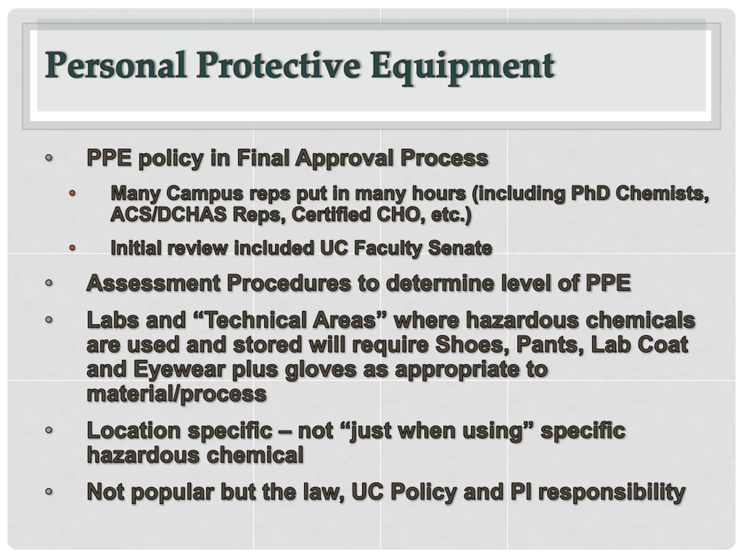 Personal Protective Equipment PPE policy in Final Approval Process Many Campus reps put in many hours (including PhD Chemists, ACS/DCHAS Reps, Certified CHO, etc.) Initial review included UC Faculty Senate Assessment Procedures to determine level of PPE Labs and Technical Areas where hazardous chemicals are used and stored will require Shoes, Pants, Lab Coat and Eyewear plus gloves as appropriate to material/process Location specific not just when using specific hazardous chemical Not popular but the law, UC Policy and PI responsibility