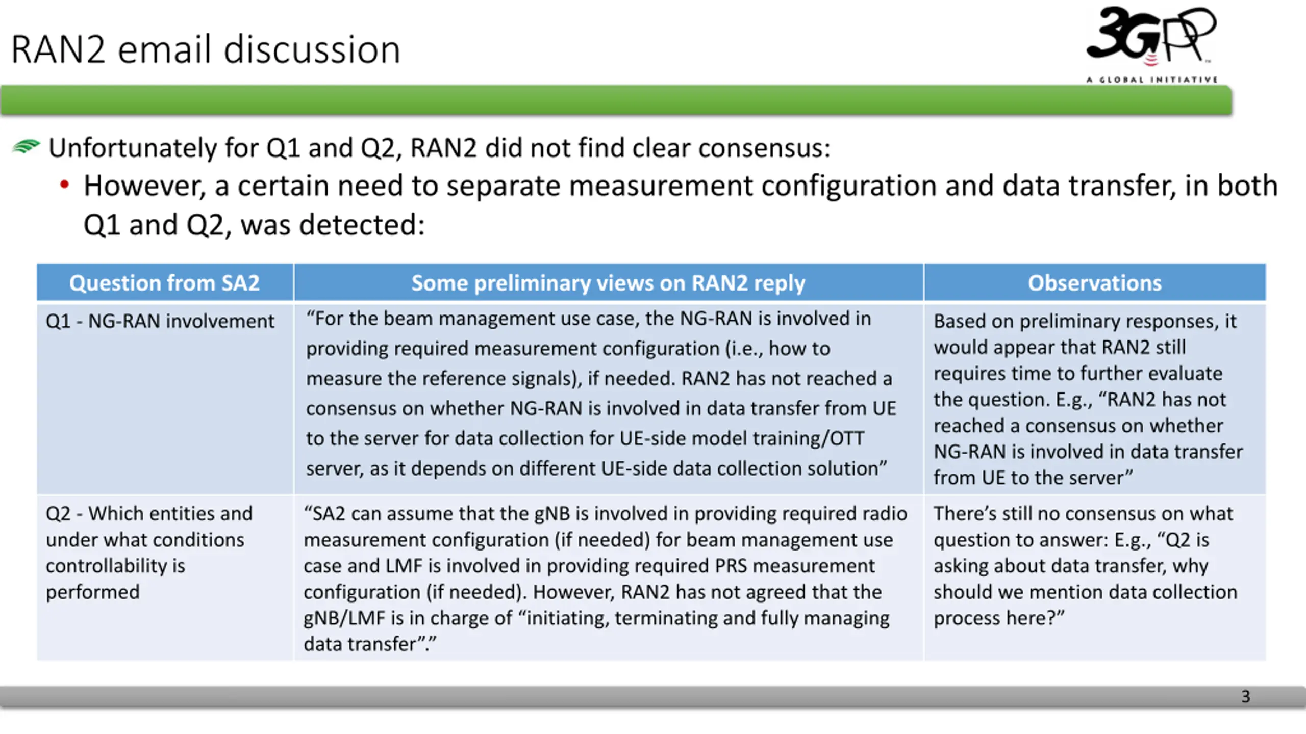 RAN2 email discussion Unfortunately for Q1 and Q2, RAN2 did not find clear consensus: However, a certain need to separate measurement configuration and data transfer, in both Q1 and Q2, was detected: Question from SA2 Some preliminary views on RAN2 reply Observations For the beam management use case, the NG-RAN is involved in providing required measurement configuration (i.e., how to measure the reference signals), if needed. RAN2 has not reached a consensus on whether NG-RAN is involved in data transfer from UE to the server for data collection for UE-side model training/OTT server, as it depends on different UE-side data collection solution Q1 - NG-RAN involvement Based on preliminary responses, it would appear that RAN2 still requires time to further evaluate the question. E.g., RAN2 has not reached a consensus on whether NG-RAN is involved in data transfer from UE to the server Q2 - Which entities and under what conditions controllability is performed SA2 can assume that the gNB is involved in providing required radio measurement configuration (if needed) for beam management use case and LMF is involved in providing required PRS measurement configuration (if needed). However, RAN2 has not agreed that the gNB/LMF is in charge of initiating, terminating and fully managing data transfer . There s still no consensus on what question to answer: E.g., Q2 is asking about data transfer, why should we mention data collection process here? 3