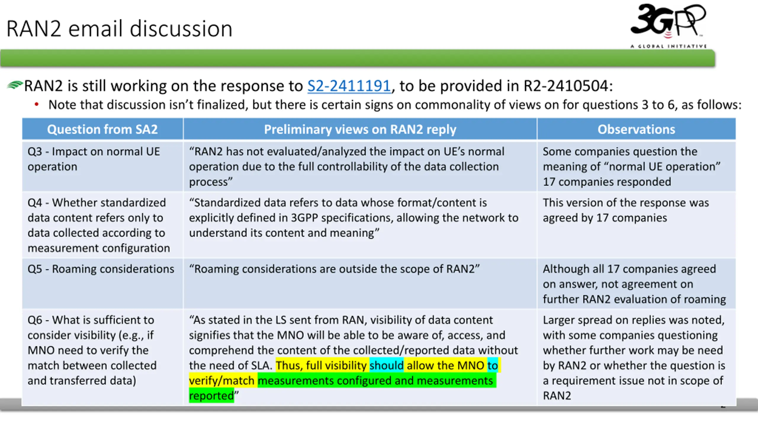 RAN2 email discussion RAN2 is still working on the response to S2-2411191, to be provided in R2-2410504: Note that discussion isn t finalized, but there is certain signs on commonality of views on for questions 3 to 6, as follows: Question from SA2 Preliminary views on RAN2 reply Observations Q3 - Impact on normal UE operation RAN2 has not evaluated/analyzed the impact on UE s normal operation due to the full controllability of the data collection process Some companies question the meaning of normal UE operation 17 companies responded Q4 - Whether standardized data content refers only to data collected according to measurement configuration Standardized data refers to data whose format/content is explicitly defined in 3GPP specifications, allowing the network to understand its content and meaning This version of the response was agreed by 17 companies Q5 - Roaming considerations Roaming considerations are outside the scope of RAN2 Although all 17 companies agreed on answer, not agreement on further RAN2 evaluation of roaming Q6 - What is sufficient to consider visibility (e.g., if MNO need to verify the match between collected and transferred data) As stated in the LS sent from RAN, visibility of data content signifies that the MNO will be able to be aware of, access, and comprehend the content of the collected/reported data without the need of SLA. Thus, full visibility should allow the MNO to verify/match measurements configured and measurements reported Larger spread on replies was noted, with some companies questioning whether further work may be need by RAN2 or whether the question is a requirement issue not in scope of RAN2 2