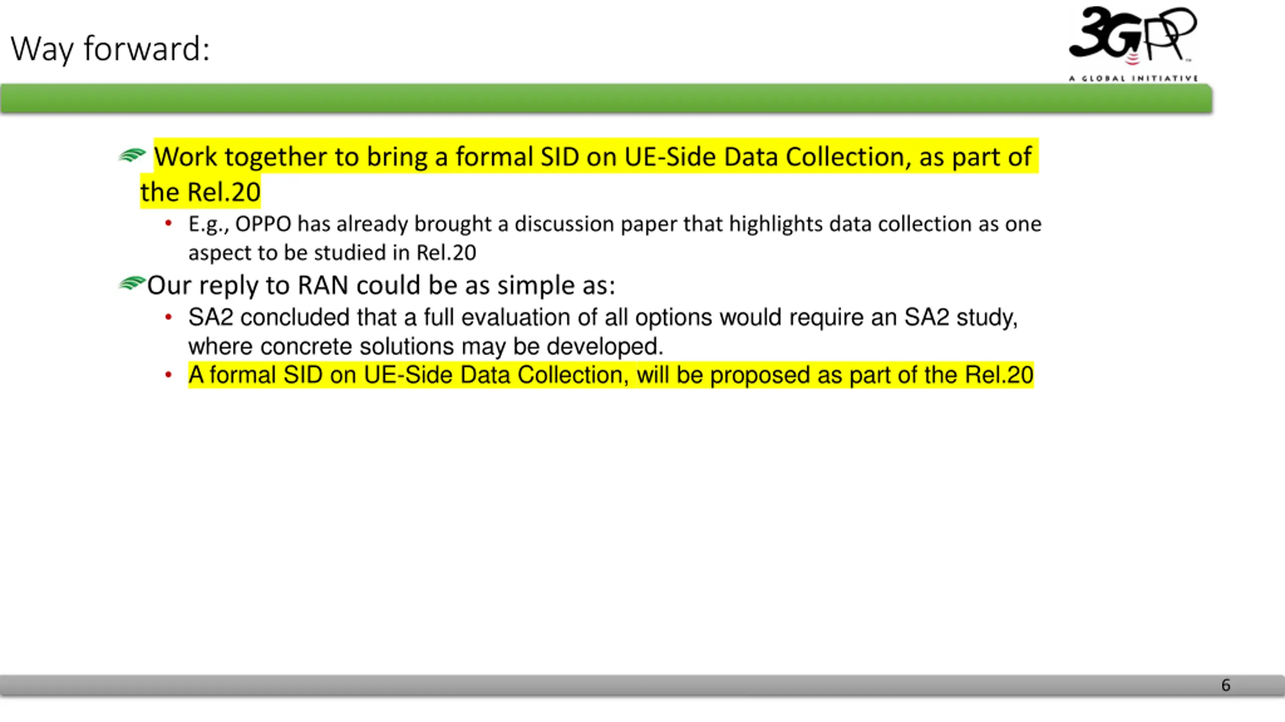Way forward: Work together to bring a formal SID on UE-Side Data Collection, as part of the Rel.20 E.g., OPPO has already brought a discussion paper that highlights data collection as one aspect to be studied in Rel.20 Our reply to RAN could be as simple as: SA2 concluded that a full evaluation of all options would require an SA2 study, where concrete solutions may be developed. A formal SID on UE-Side Data Collection, will be proposed as part of the Rel.20 6
