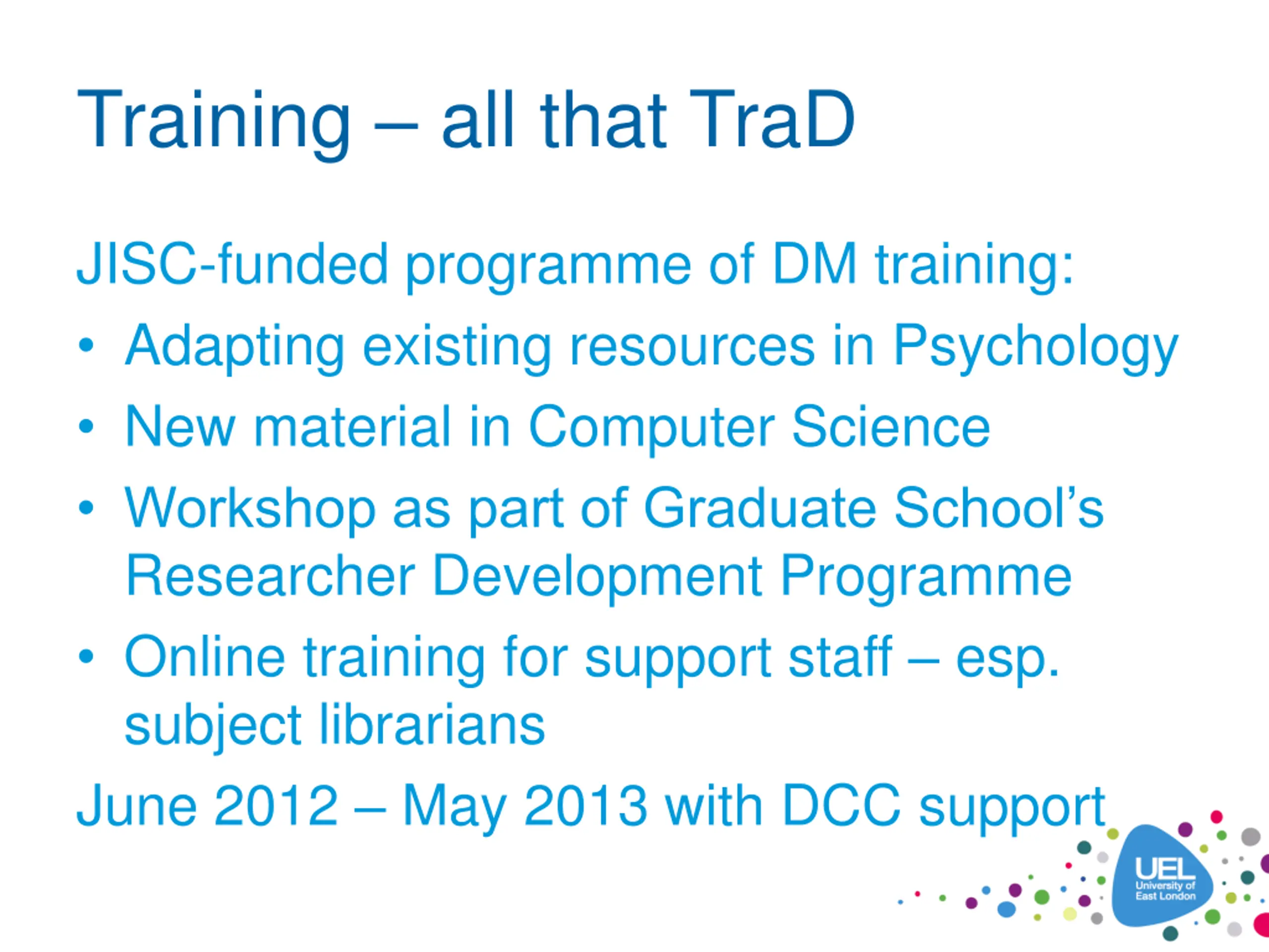 Training all that TraD JISC-funded programme of DM training: Adapting existing resources in Psychology New material in Computer Science Workshop as part of Graduate School s Researcher Development Programme Online training for support staff esp. subject librarians June 2012 May 2013 with DCC support