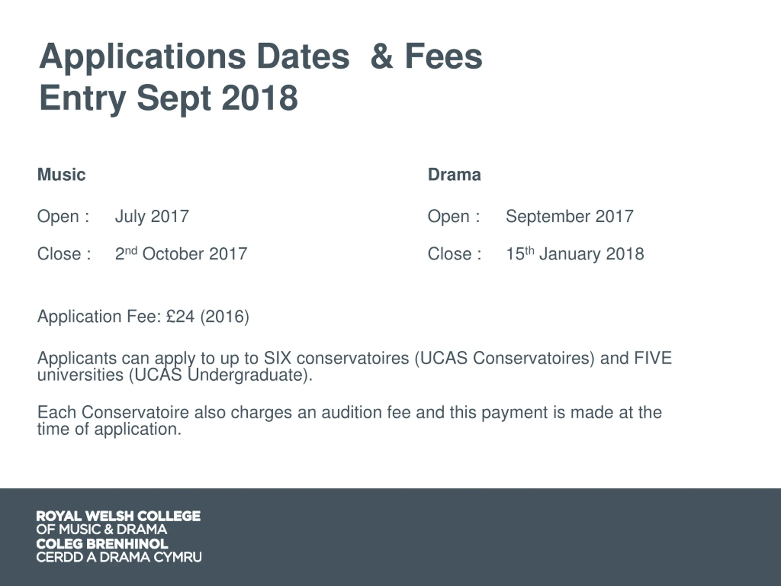 Applications Dates & Fees Entry Sept 2018 Music Drama Open : July 2017 Open : September 2017 Close : 2ndOctober 2017 Close : 15thJanuary 2018 Application Fee: 24 (2016) Applicants can apply to up to SIX conservatoires (UCAS Conservatoires) and FIVE universities (UCAS Undergraduate). Each Conservatoire also charges an audition fee and this payment is made at the time of application.