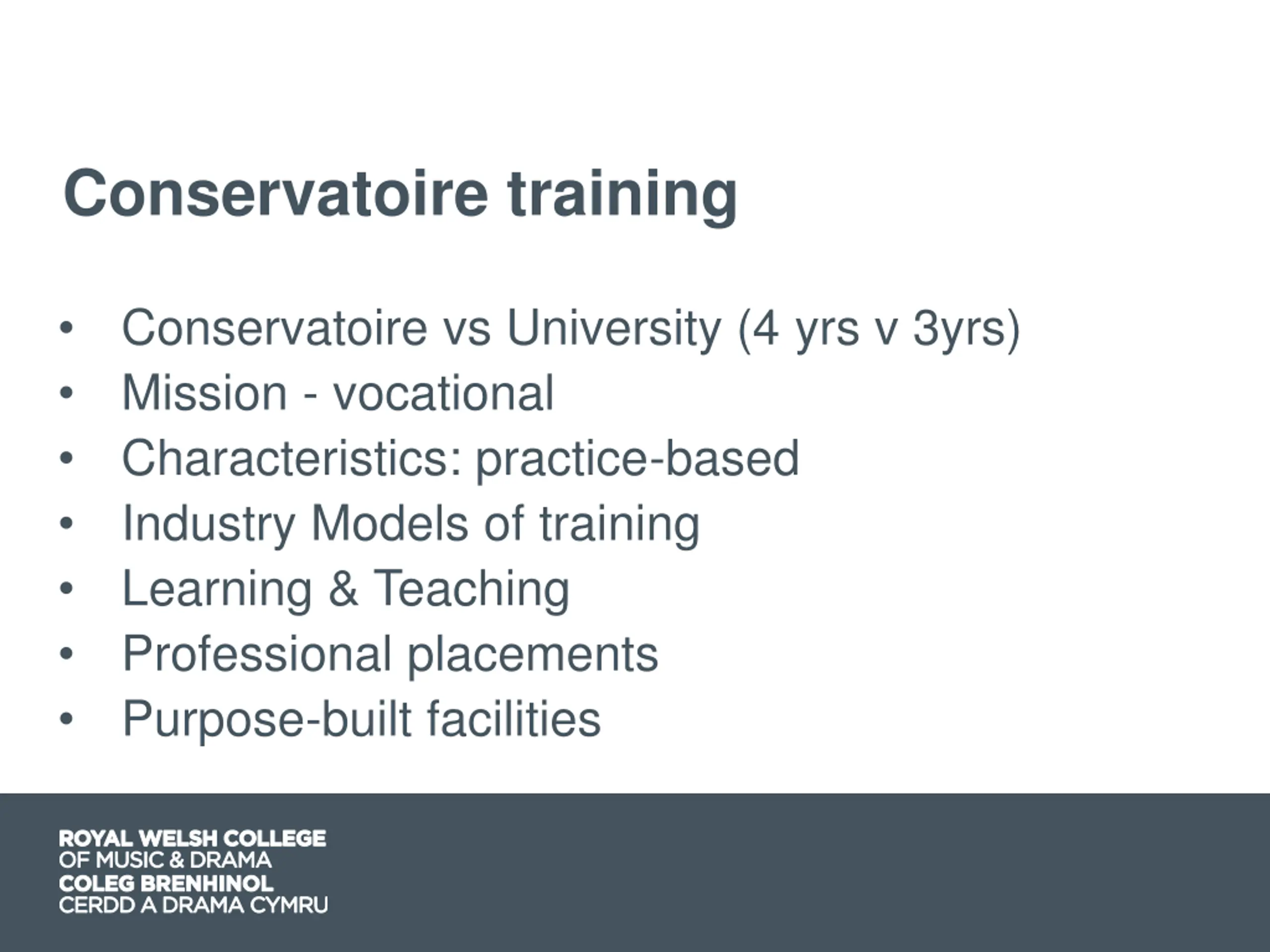 Conservatoire training Conservatoire vs University (4 yrs v 3yrs) Mission - vocational Characteristics: practice-based Industry Models of training Learning & Teaching Professional placements Purpose-built facilities