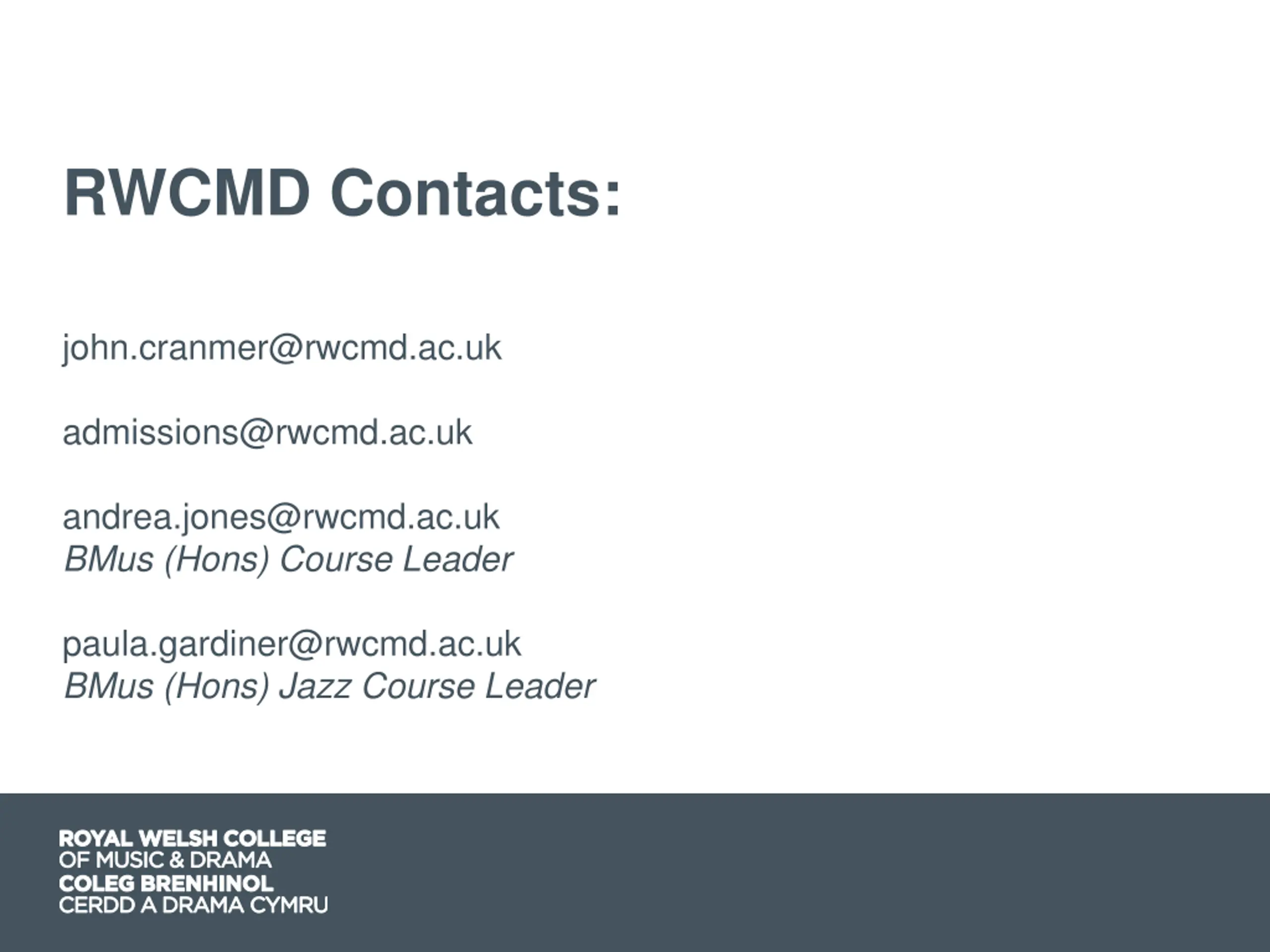 RWCMD Contacts: john.cranmer@rwcmd.ac.uk admissions@rwcmd.ac.uk andrea.jones@rwcmd.ac.uk BMus (Hons) Course Leader ula.gardiner@rwcmd.ac.uk paula.gardiner@rwcmd.ac.uk BMus (Hons) Jazz Course Leader