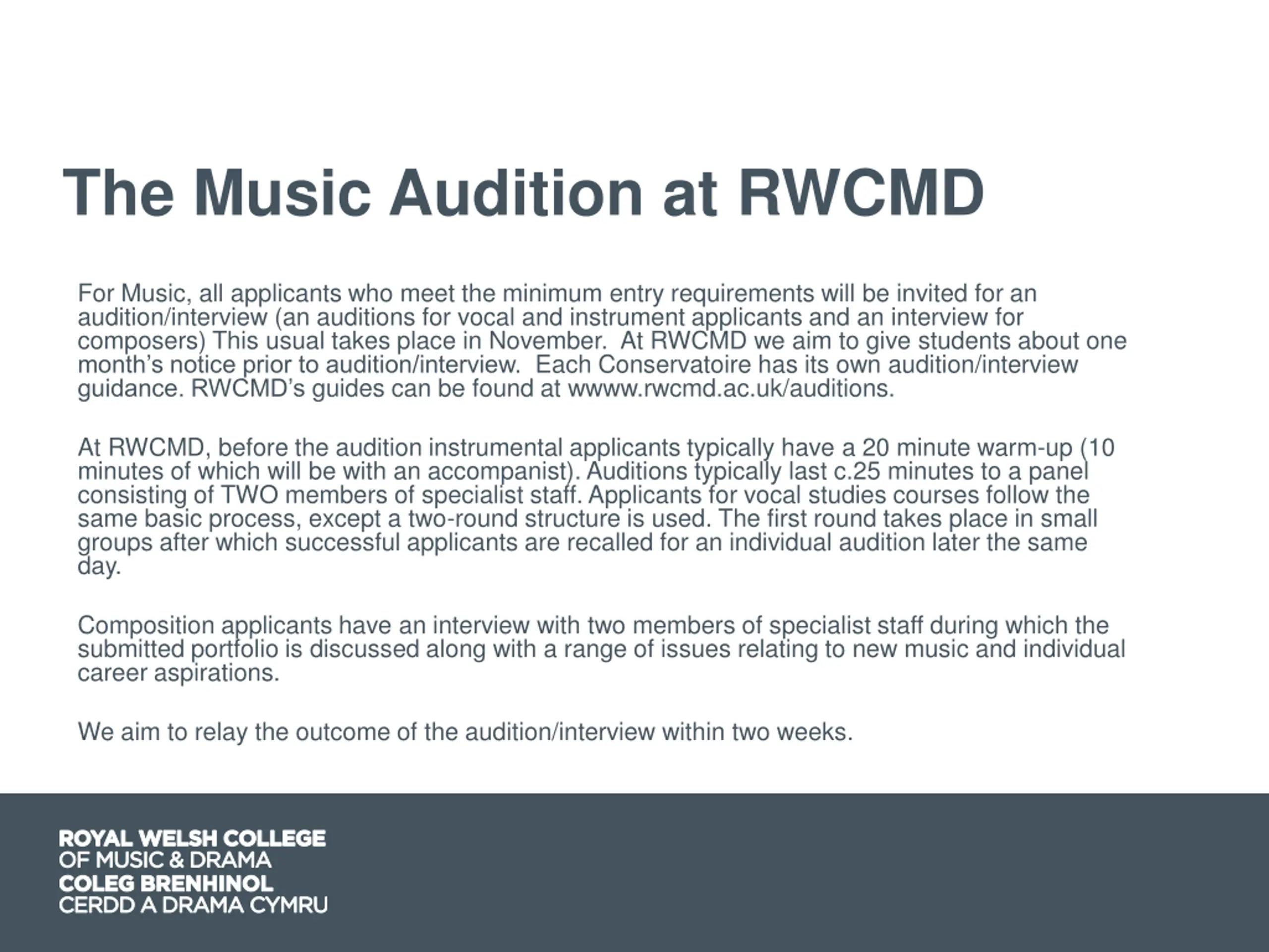 The Music Audition at RWCMD For Music, all applicants who meet the minimum entry requirements will be invited for an audition/interview (an auditions for vocal and instrument applicants and an interview for composers) This usual takes place in November. At RWCMD we aim to give students about one month s notice prior to audition/interview. Each Conservatoire has its own audition/interview guidance. RWCMD s guides can be found at wwww.rwcmd.ac.uk/auditions. At RWCMD, before the audition instrumental applicants typically have a 20 minute warm-up (10 minutes of which will be with an accompanist). Auditions typically last c.25 minutes to a panel consisting of TWO members of specialist staff. Applicants for vocal studies courses follow the same basic process, except a two-round structure is used. The first round takes place in small groups after which successful applicants are recalled for an individual audition later the same day. Composition applicants have an interview with two members of specialist staff during which the submitted portfolio is discussed along with a range of issues relating to new music and individual career aspirations. We aim to relay the outcome of the audition/interview within two weeks.