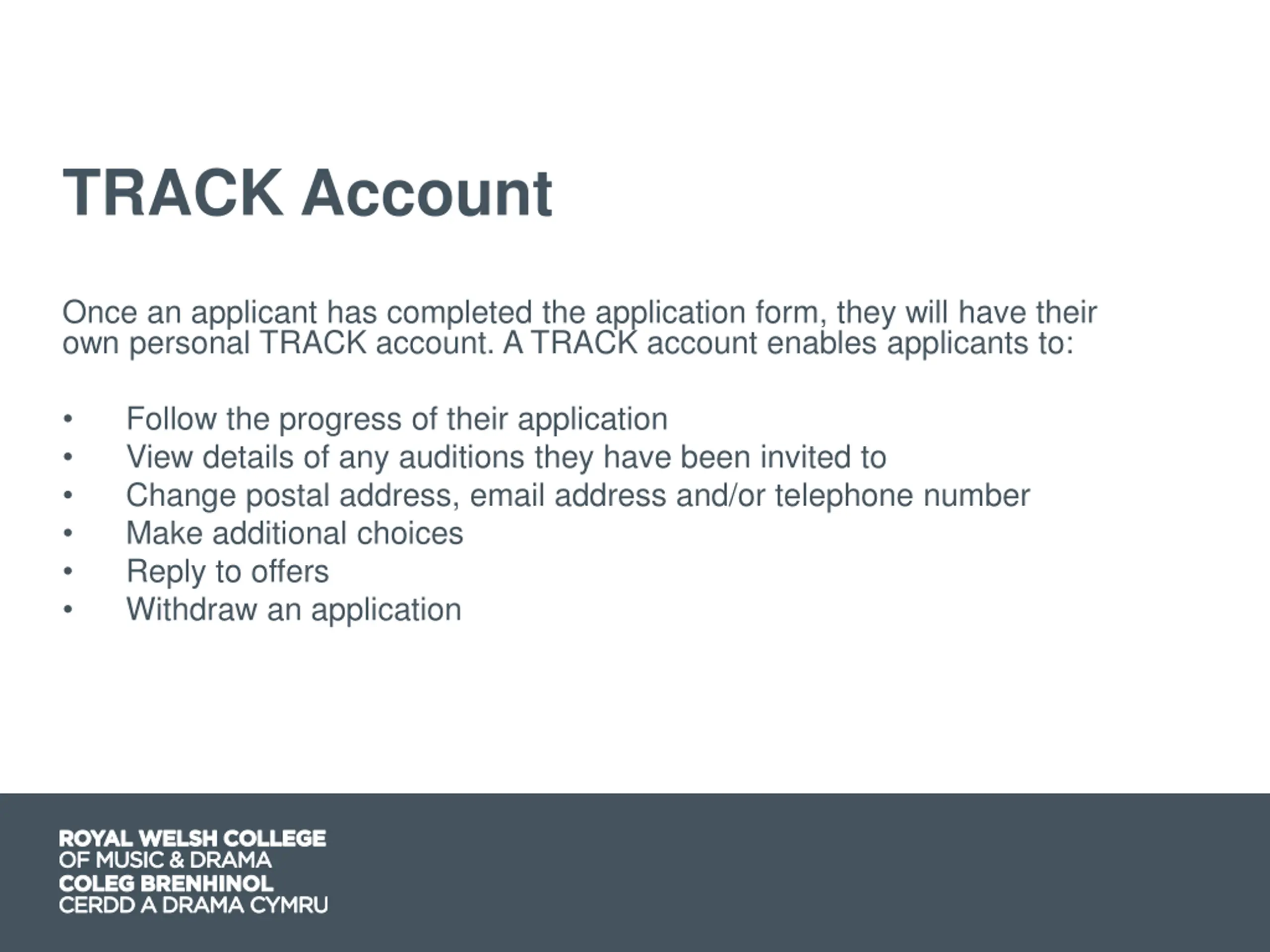 TRACK Account Once an applicant has completed the application form, they will have their own personal TRACK account. A TRACK account enables applicants to: Follow the progress of their application View details of any auditions they have been invited to Change postal address, email address and/or telephone number Make additional choices Reply to offers Withdraw an application