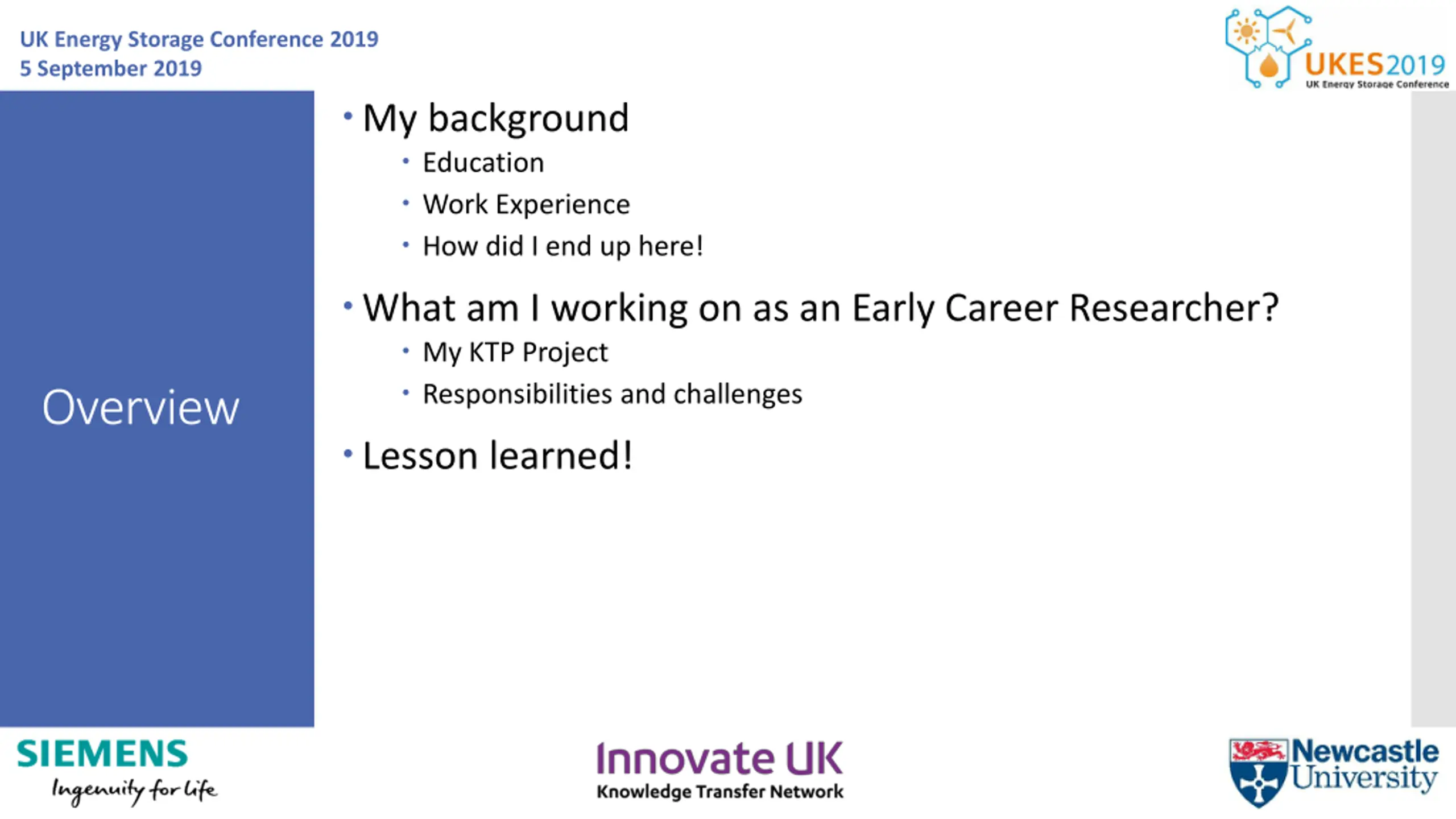 UK Energy Storage Conference 2019 5 September 2019 My background Education Work Experience How did I end up here! What am I working on as an Early Career Researcher? My KTP Project Responsibilities and challenges Overview Lesson learned!