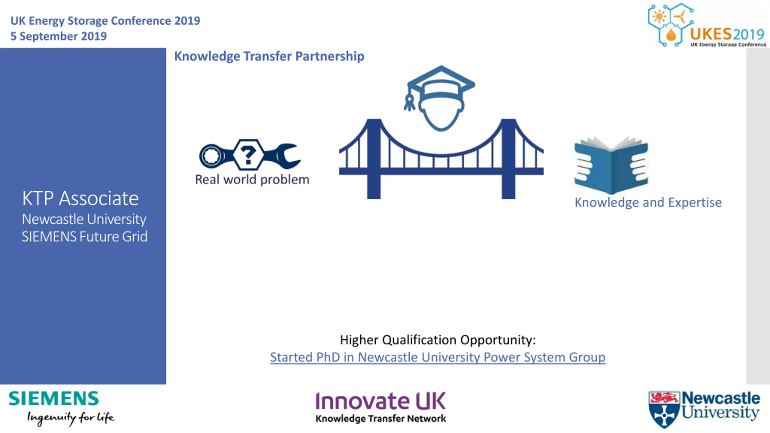 UK Energy Storage Conference 2019 5 September 2019 Knowledge Transfer Partnership Real world problem KTP Associate Newcastle University SIEMENS Future Grid Knowledge and Expertise Higher Qualification Opportunity: Started PhD in Newcastle University Power System Group