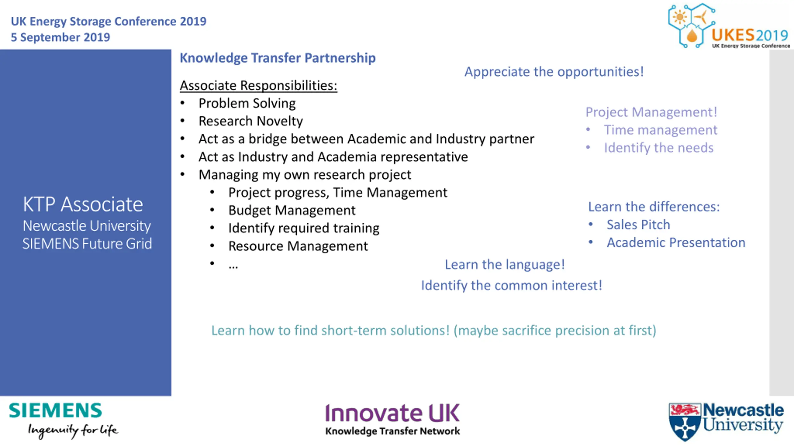 UK Energy Storage Conference 2019 5 September 2019 Knowledge Transfer Partnership Appreciate the opportunities! Associate Responsibilities: Problem Solving Research Novelty Act as a bridge between Academic and Industry partner Act as Industry and Academia representative Managing my own research project Project progress, Time Management Budget Management Identify required training Resource Management Project Management! Time management Identify the needs KTP Associate Newcastle University SIEMENS Future Grid Learn the differences: Sales Pitch Academic Presentation Learn the language! Identify the common interest! Learn how to find short-term solutions! (maybe sacrifice precision at first)