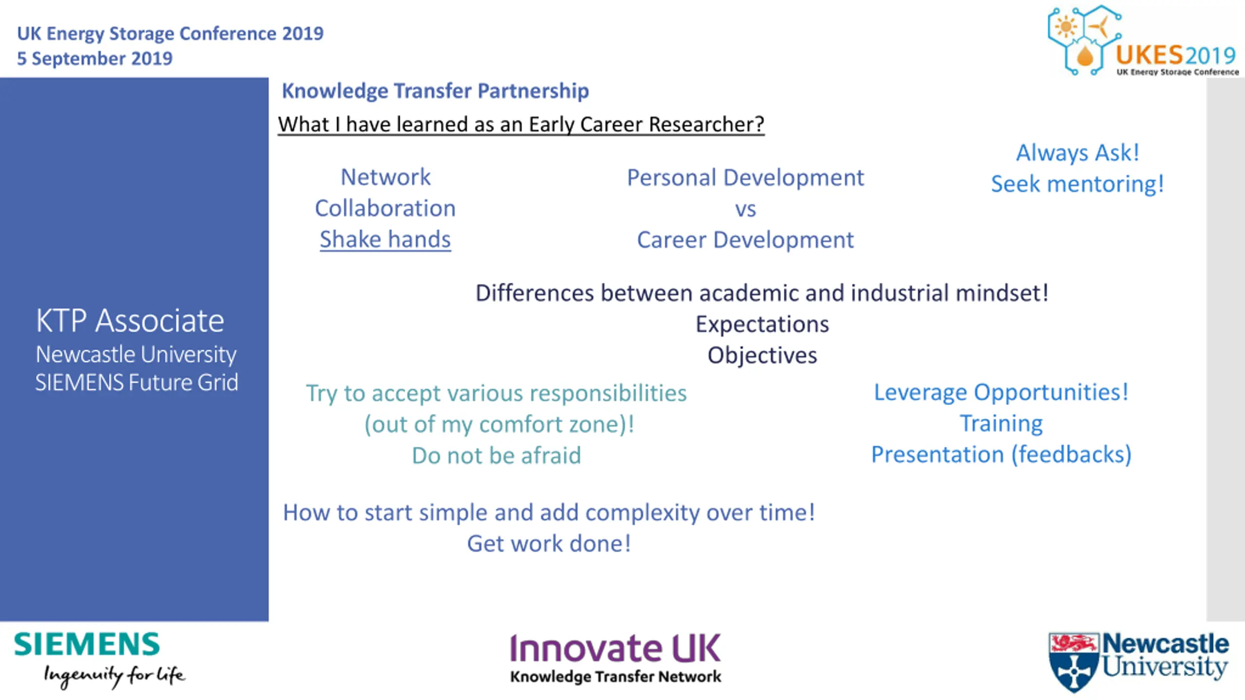 UK Energy Storage Conference 2019 5 September 2019 Knowledge Transfer Partnership What I have learned as an Early Career Researcher? Always Ask! Seek mentoring! Network Collaboration Shake hands Personal Development vs Career Development Differences between academic and industrial mindset! Expectations Objectives Try to accept various responsibilities (out of my comfort zone)! Do not be afraid KTP Associate Newcastle University SIEMENS Future Grid Leverage Opportunities! Training Presentation (feedbacks) How to start simple and add complexity over time! Get work done!