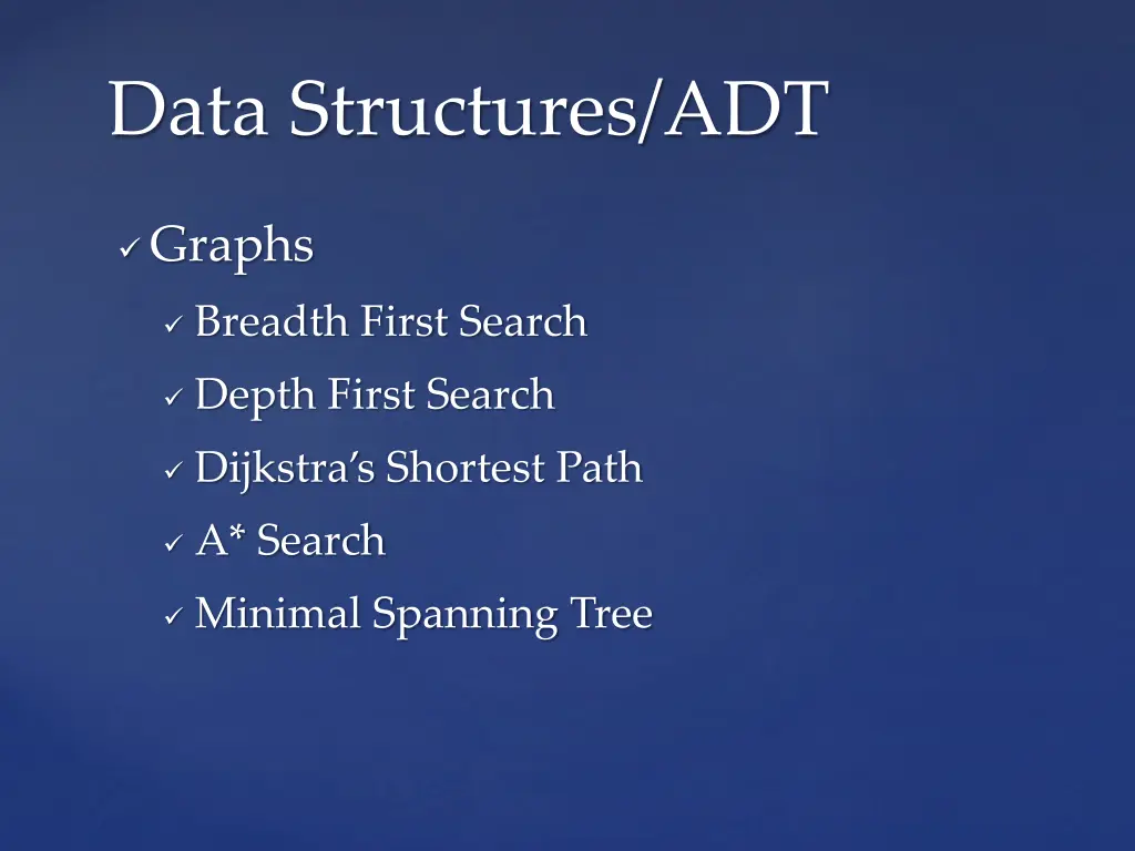 Data Structures/ADT Graphs Breadth First Search Depth First Search Dijkstra s Shortest Path A* Search Minimal Spanning Tree