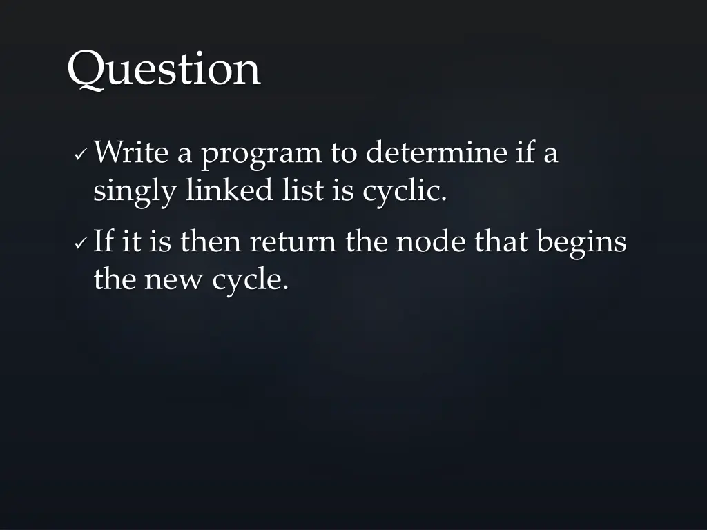 Question Write a program to determine if a singly linked list is cyclic. If it is then return the node that begins the new cycle.