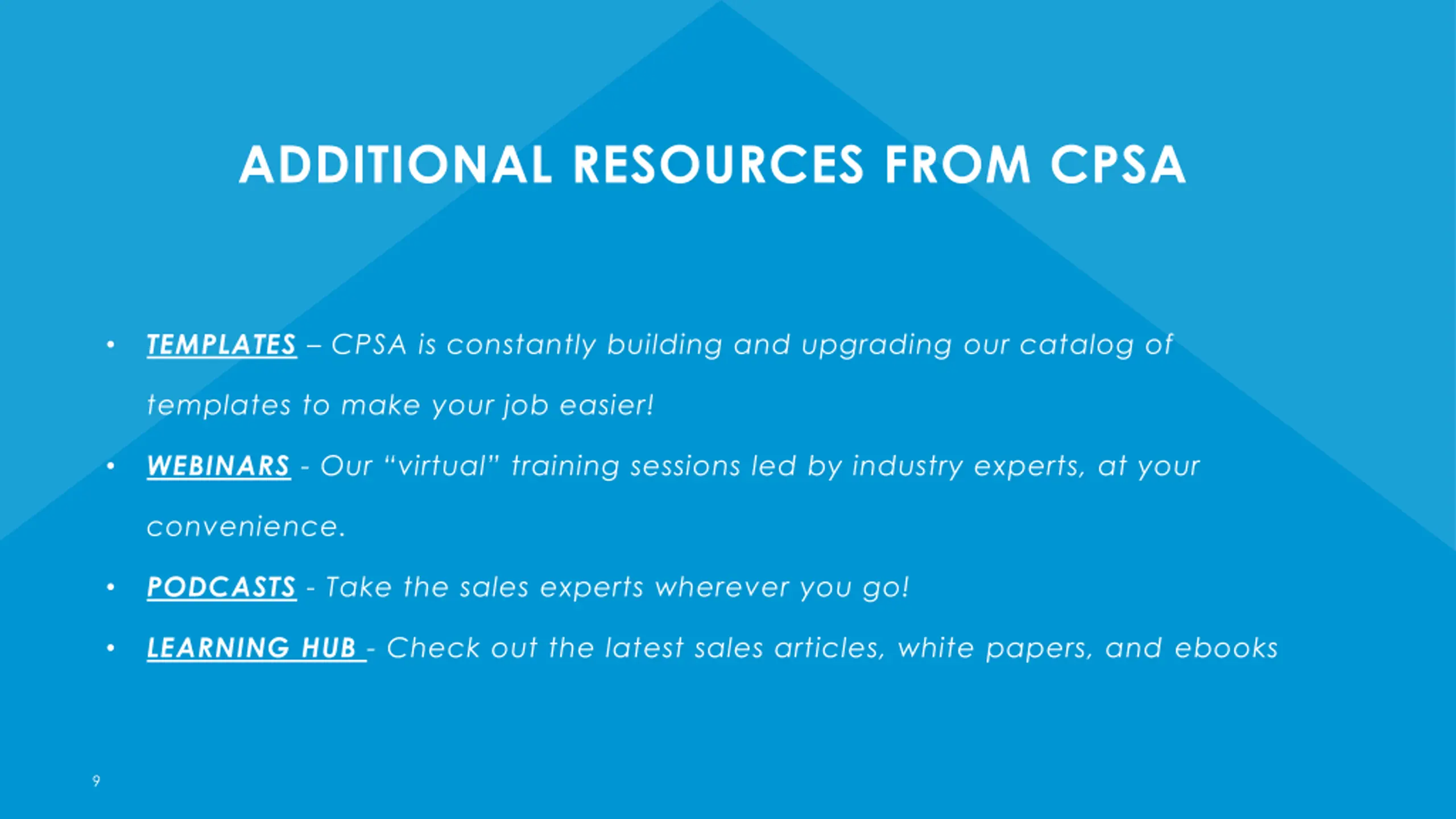 ADDITIONAL RESOURCES FROM CPSA TEMPLATES CPSA is constantly building and upgrading our catalog of templates to make your job easier! WEBINARS - Our virtual training sessions led by industry experts, at your convenience. PODCASTS - Take the sales experts wherever you go! LEARNING HUB - Check out the latest sales articles, white papers, and ebooks 9