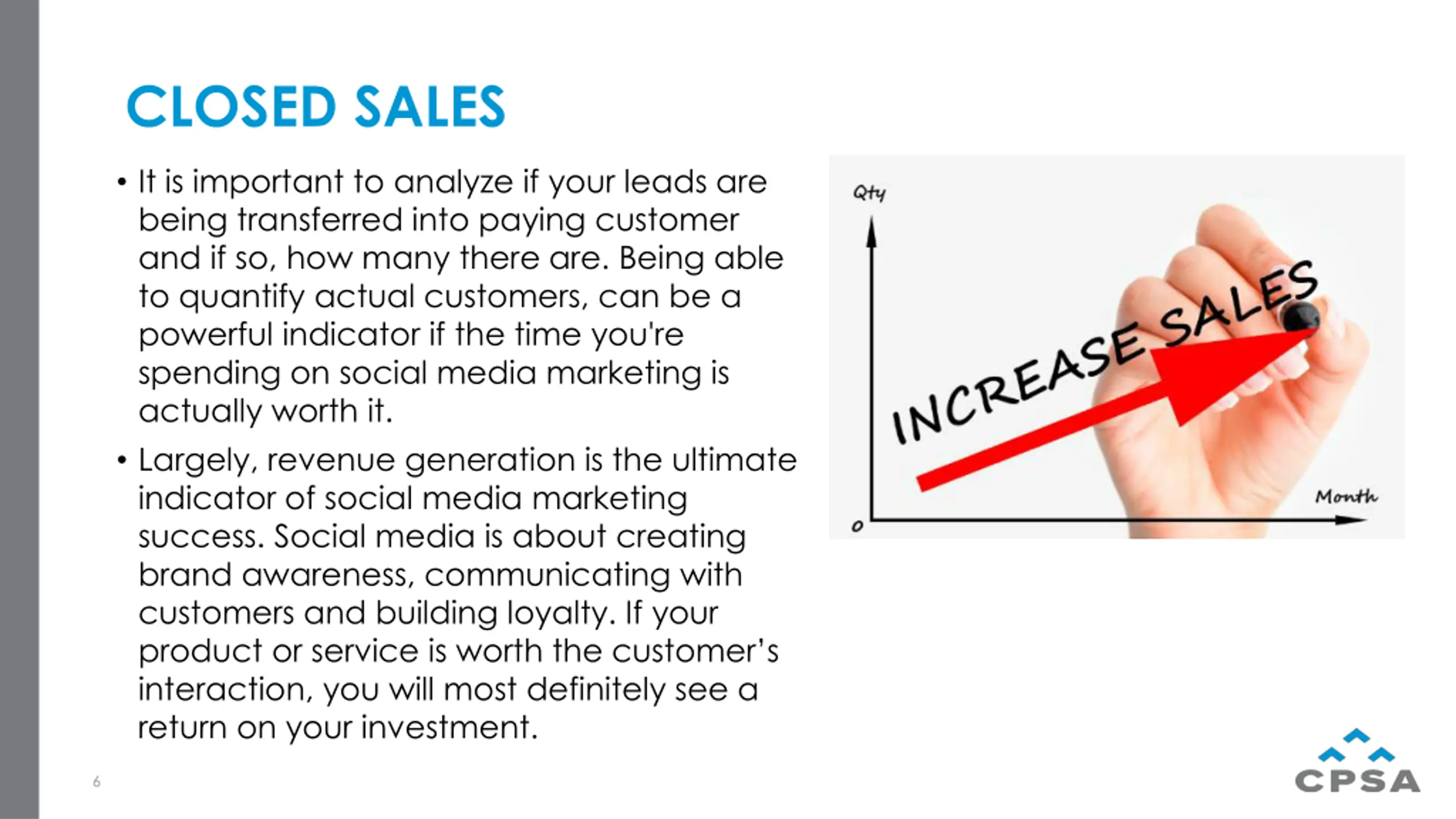 CLOSED SALES It is important to analyze if your leads are being transferred into paying customer and if so, how many there are. Being able to quantify actual customers, can be a powerful indicator if the time you're spending on social media marketing is actually worth it. Largely, revenue generation is the ultimate indicator of social media marketing success. Social media is about creating brand awareness, communicating with customers and building loyalty. If your product or service is worth the customer s interaction, you will most definitely see a return on your investment. 6