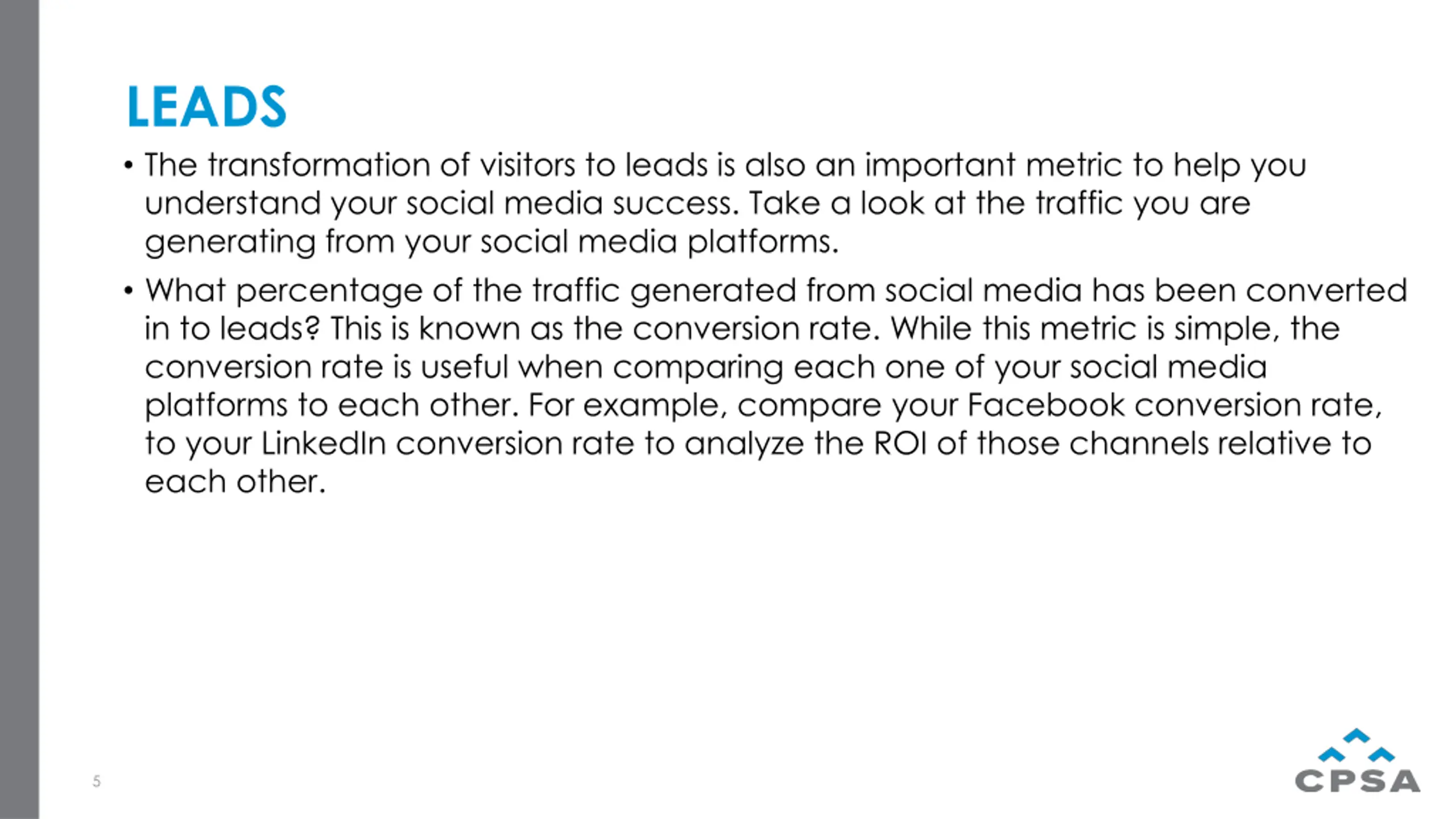 LEADS The transformation of visitors to leads is also an important metric to help you understand your social media success. Take a look at the traffic you are generating from your social media platforms. What percentage of the traffic generated from social media has been converted in to leads? This is known as the conversion rate. While this metric is simple, the conversion rate is useful when comparing each one of your social media platforms to each other. For example, compare your Facebook conversion rate, to your LinkedIn conversion rate to analyze the ROI of those channels relative to each other. 5
