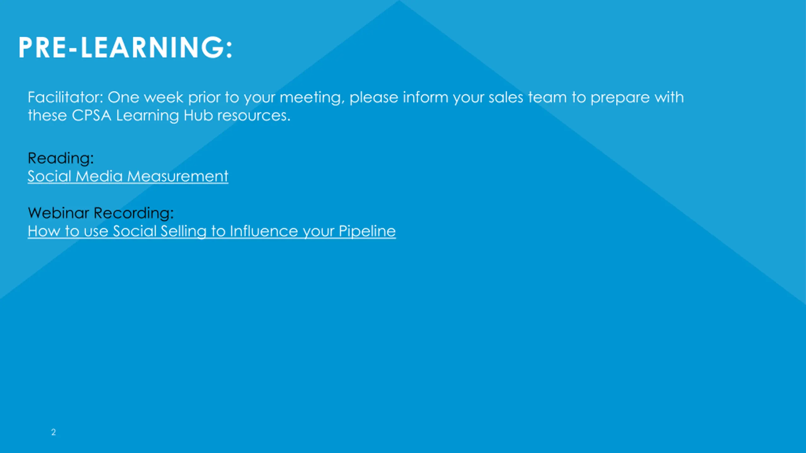 PRE-LEARNING: Facilitator: One week prior to your meeting, please inform your sales team to prepare with these CPSA Learning Hub resources. Reading: Social Media Measurement Webinar Recording: How to use Social Selling to Influence your Pipeline 2