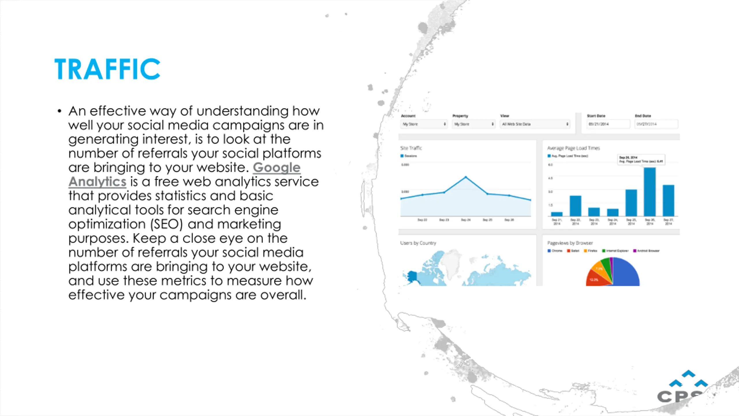 TRAFFIC An effective way of understanding how well your social media campaigns are in generating interest, is to look at the number of referrals your social platforms are bringing to your website. Google Analytics is a free web analytics service that provides statistics and basic analytical tools for search engine optimization (SEO) and marketing purposes. Keep a close eye on the number of referrals your social media platforms are bringing to your website, and use these metrics to measure how effective your campaigns are overall. 7