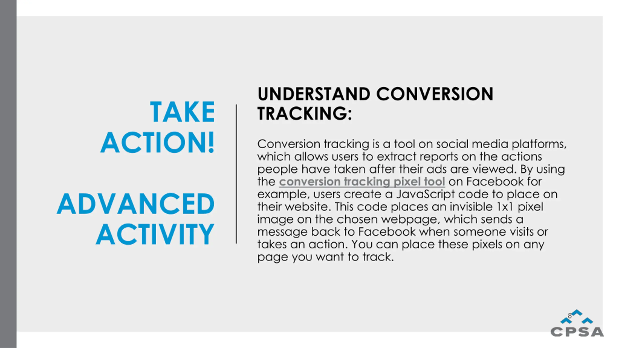 UNDERSTAND CONVERSION TRACKING: TAKE ACTION! Conversion tracking is a tool on social media platforms, which allows users to extract reports on the actions people have taken after their ads are viewed. By using the conversion tracking pixel tool on Facebook for example, users create a JavaScript code to place on their website. This code places an invisible 1x1 pixel image on the chosen webpage, which sends a message back to Facebook when someone visits or takes an action. You can place these pixels on any page you want to track. ADVANCED ACTIVITY